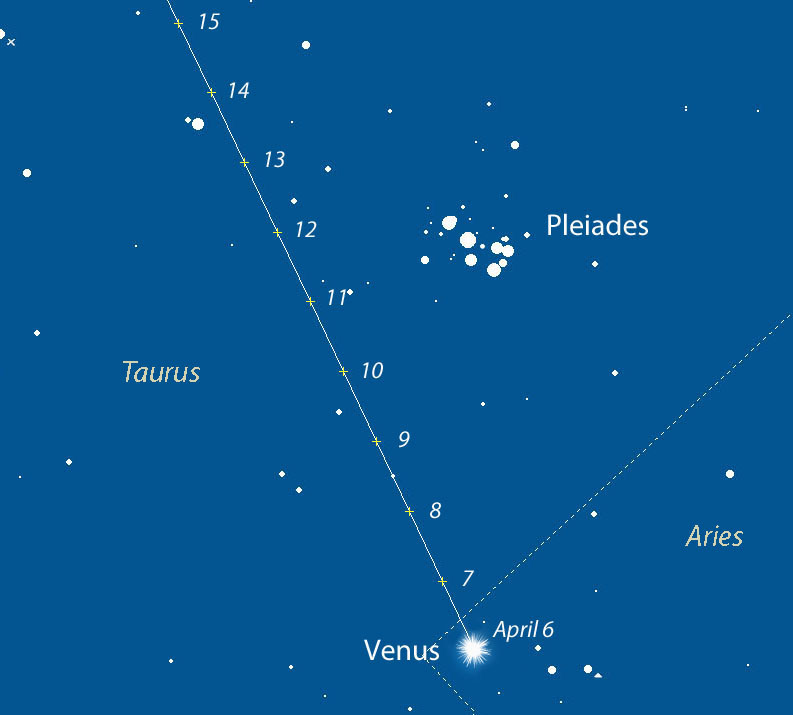 В ближайшие несколько дней можно наблюдать сближение самой яркой планеты Венера с известным рассеяным скоплением Плеяды в созвездии Тельца Это интересное астрономическое явление можно наблюдать в вечернее время в западном направлении после захода Солнца. Самое тесное сближение объектов произойдет 10-11 апреля 2015 года.