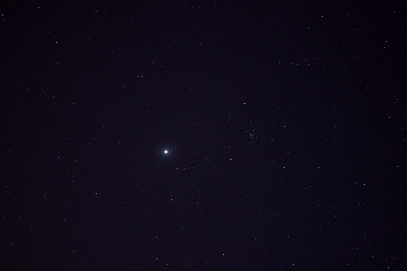 сегодня смотрел сближение Плеяд и Венеры. Ещё не совсем рядом,завтра наверное будут ближе. В телескоп смотреть было безсмыслено...пара помещалась только в бинокль и искатель. Попробывал зделать фото через искатель,но опять же...смартфон. Звёзды не видит вообще,уже когда поставил ISО 1600 тогда ели-ели зачепился за звёзды. Фото не в обсуждение..я просто запечетлил факт.