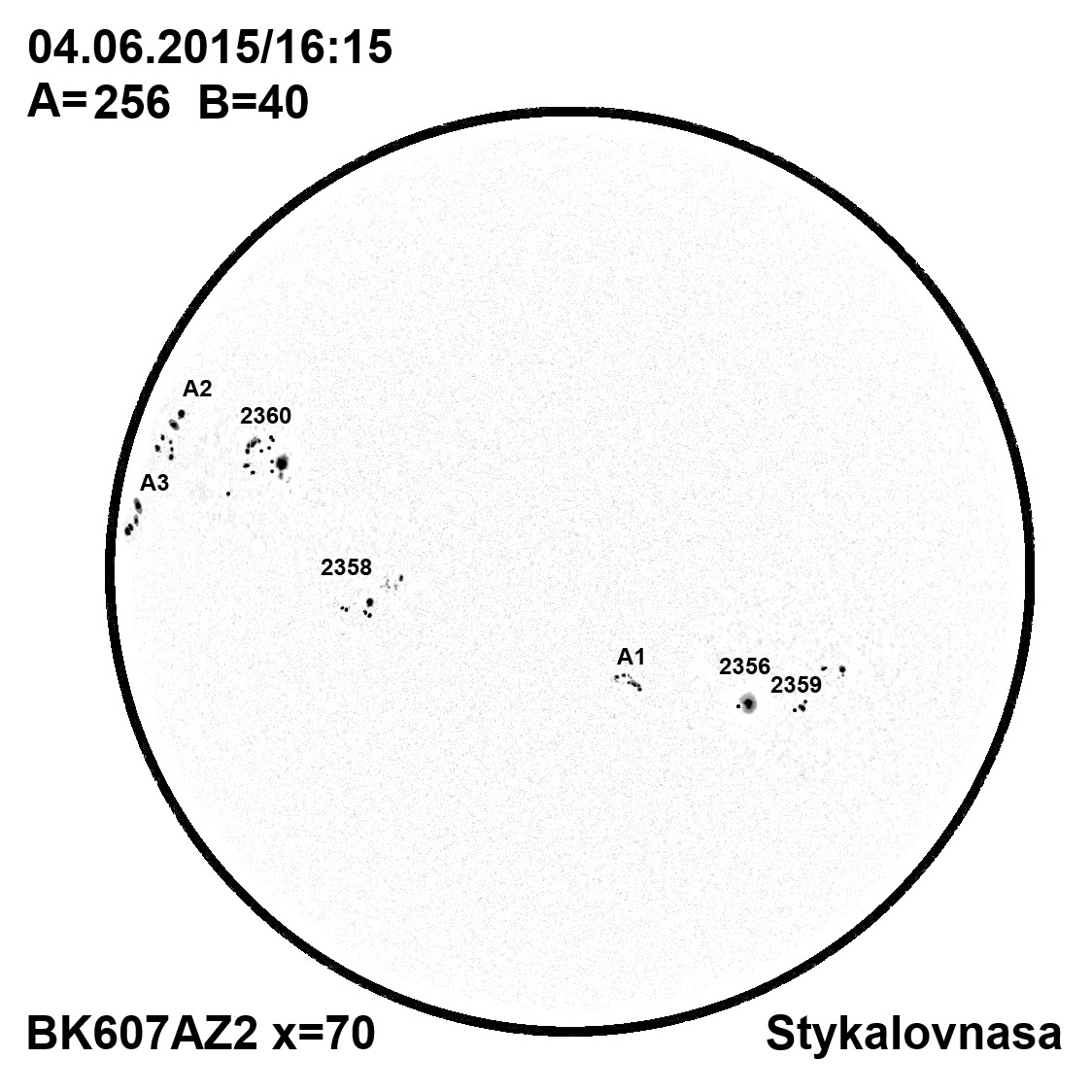 При наблюдении в телескоп ТАЛ65 группа солнечных пятен AR2356 наблюдалась весьма хорошо. В группе просматривалось одно крупное солнечное пятно, также были заметны отдельные малозаметные солнечные пятна этой группы. Всего группа AR2356 состояла из 3 солнечных пятен. Группа AR2357 в телескоп ТАЛ65 наблюдалась на пределе видимости, так как в группе не было крупных солнечных пятен. Сама группа AR2357 состояла из 4 солнечных малозаметных пятен.