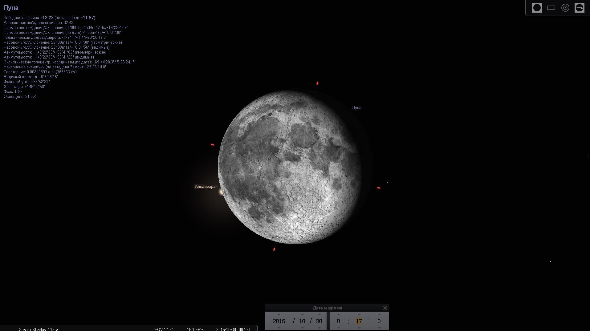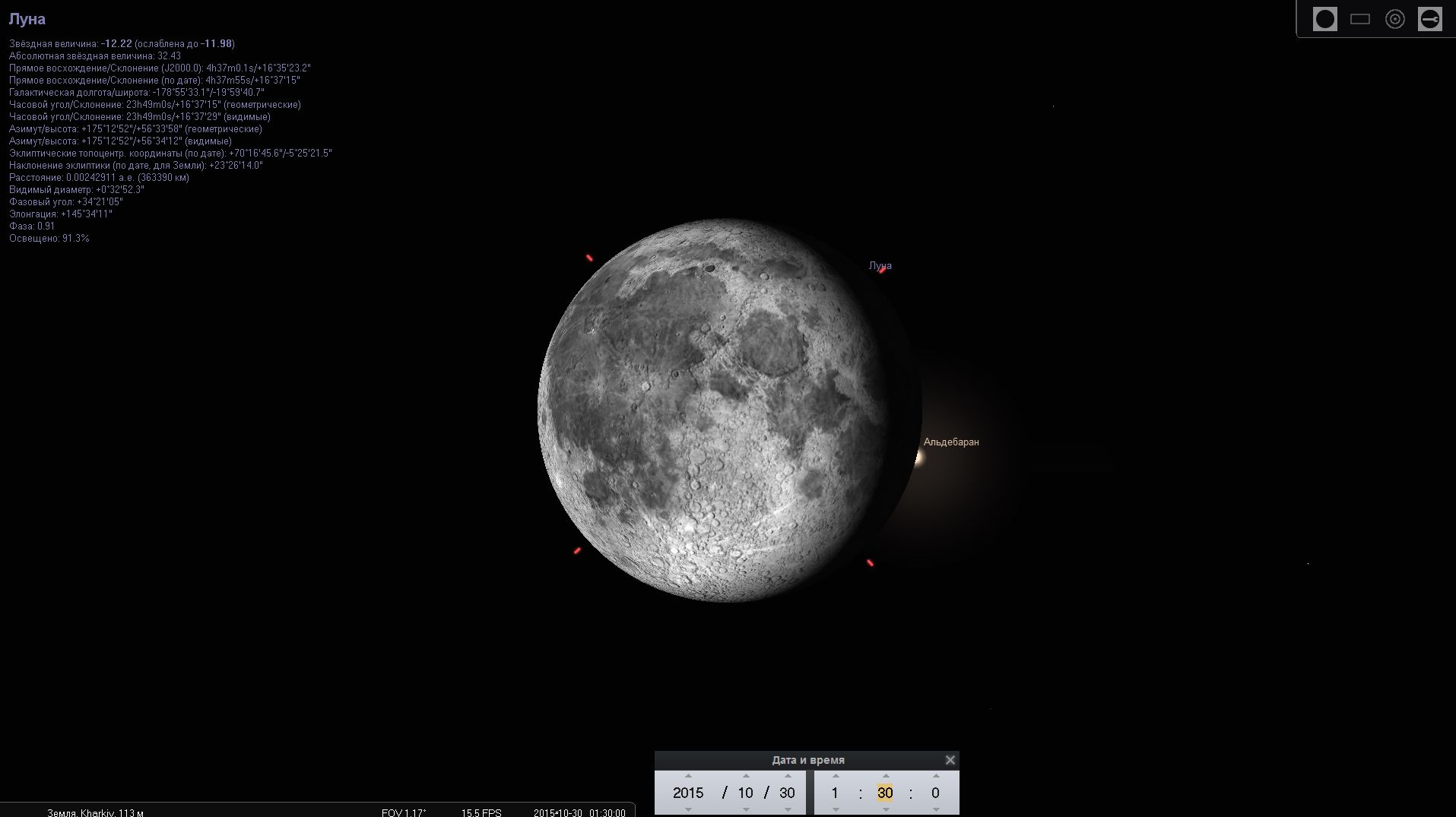 Луна в фазе 0,92 будет покрывать Альдебаран своим освещенным краем, начало покрытия около 00час 18 мин.