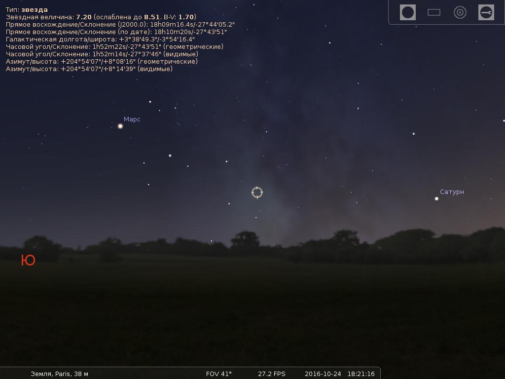 20 октября 2016 года известным японским любителем астрономии Koichi Itagaki в созвездии Стрельца была открыта Новая звезда.На момент открытия она имела блеск 10,7m. По последним данным (23 октября) блеск Новой достиг 8m! К сожалению условия для её наблюдения на широте Харькова далеки от благоприятных. Около 19 часов по киевскому времени на еще сравнительно светлом небе высота над горизонтом всего 7 градусов. Да и с небом проблемы. В южных районах условия видимости несколько лучше. Координаты Новой: RA=18h 10m 28.29s, DEC=-27d 29' 59.0".