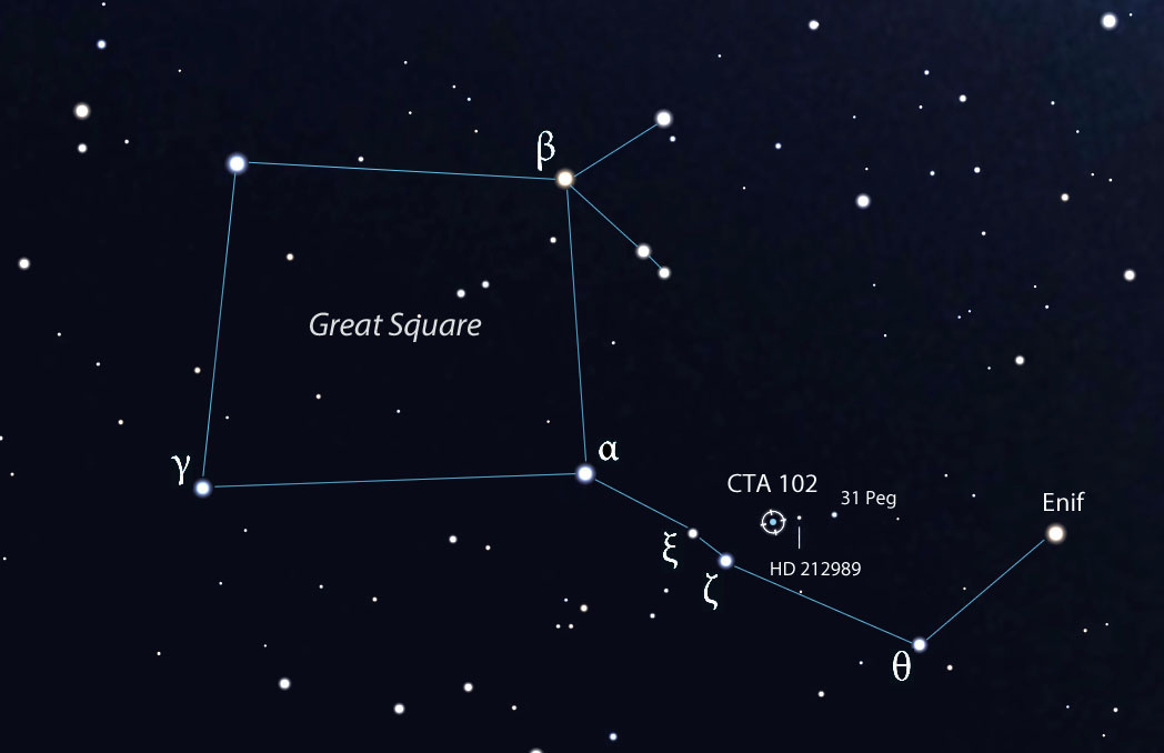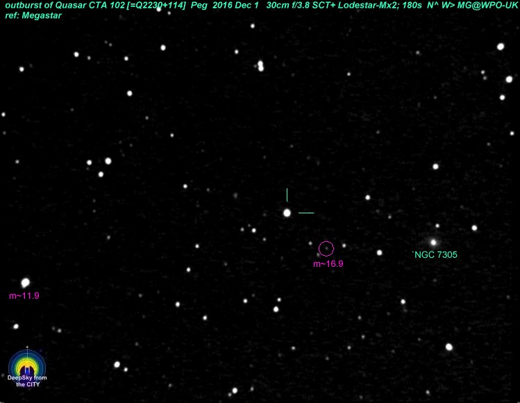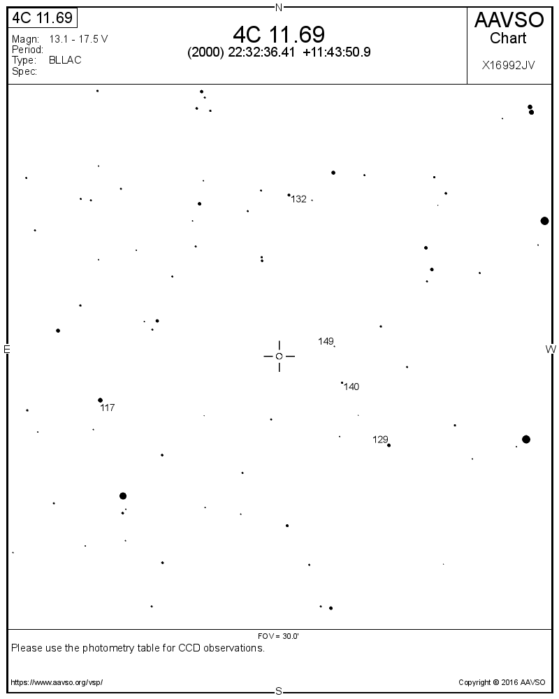 Появилась информация о вспышке блазара 4C 11.69, расположенного в созвездии Пегаса на расстоянии более 11 млрд. св. лет! (Это расстояние зависит от выбранной космологической модели). Судя по красному смещению z=1.037 этот блазар находится заметно дальше квазара Q 1634+706, наблюдавшегося группой любителей астрономии во время встречи под Красноградом в июле 2015 года.