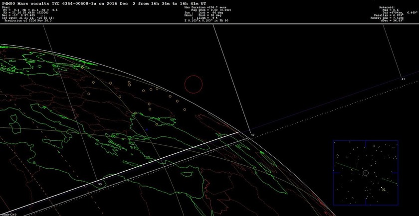 Правда, условия для наблюдений в Украине довольно посредственные (даже без учета прогноза погоды). Покрытие произойдет в промежутке от 18:39 до 18:40 по киевскому времени на высоте около 16 градусов над горизонтом (для 50-й широты). При этом блеск Марса около 0,65m, а покрываемой звезды 9,4m. Хотя покрытие будет неосвещенным краем Марса (фаза 0,88 и видимый диаметр диска 6,5"), разница в блеске будет сильно затруднять наблюдение явления. Пожалуй, апертура понадобится не менее 150-200 мм и возможно большее увеличение.