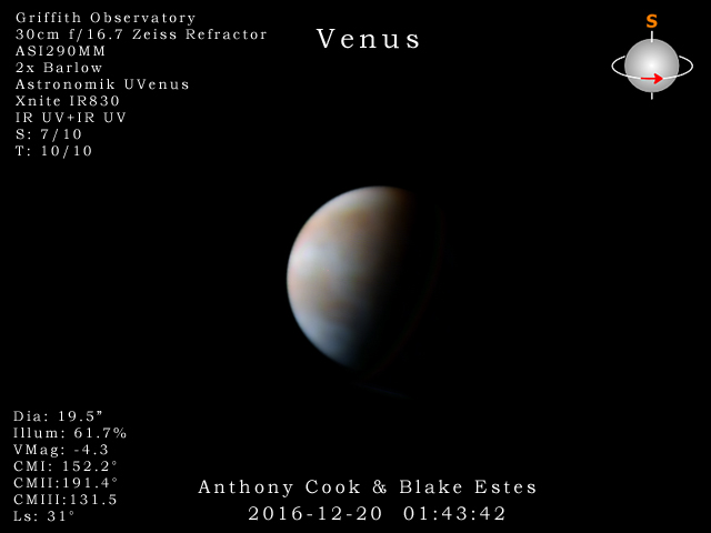 Наблюдал сегодня вечером Венеру, яркость как всегда избыточна. В этот раз попробовал поставить UHC фильтр, как не странно фильтр хорошо работает. Временами даже намёки на детали были. Вобщем у кого есть пробуйте. И ещё я заметил, что у Венеры сегодня примерно та же фаза, что и у Луны.