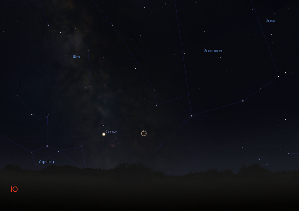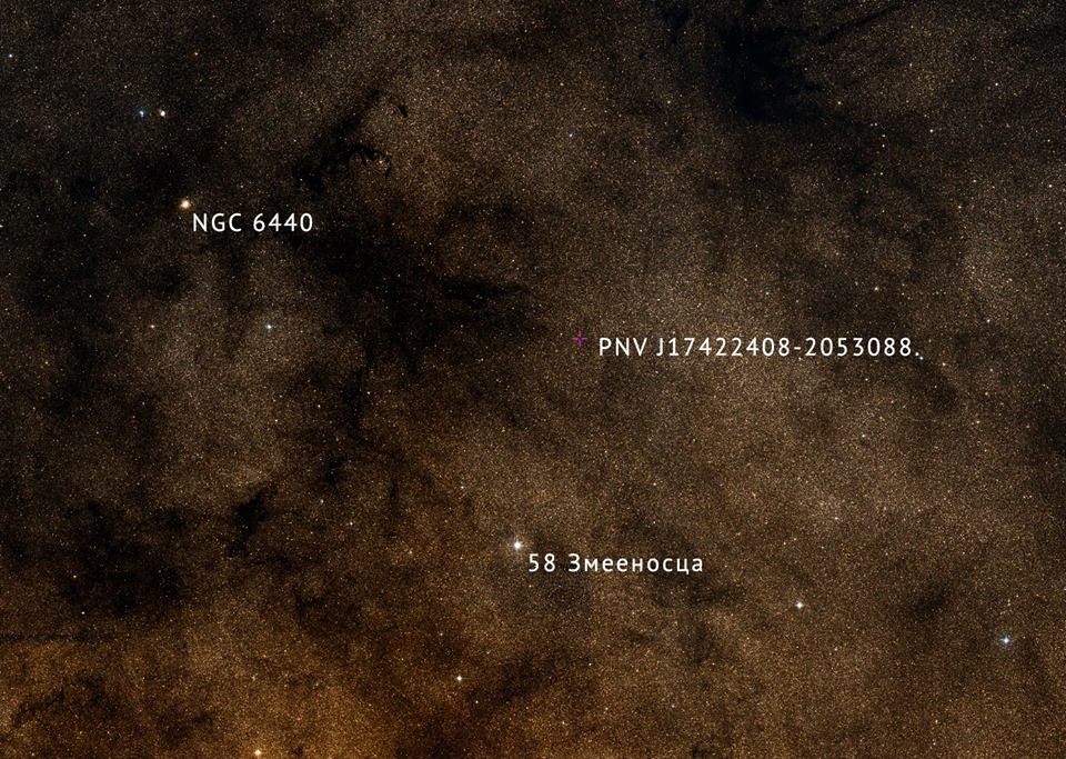 В Змееносце возможно открыта ещё одна Новая! 8 августа 2018 года в бразильской обсерватории SONEAR Observatary наблюдателями Cristóvão Jacques, João Ribeiro de Barros, Eduardo Pimentel, Paulo Renato Holvorcem (Brazilian Transient Search) обнаружена звездa с блеском 11,1m, на месте которой на снимке месячной давности нет объектов ярче 16m. Предварительное обозначение PNV J17422408-2053088 https://www.aavso.org/pnv-j17422408-205 ... -ophiuchusКоординаты объекта: R.A. 17h42m24.08s, Decl. -20°53'08.8" (J2000.0) Находится на расстоянии менее 1 градуса от звезды 58 Змееносца (4,9m). Наблюдать можно сразу с наступлением темноты.  Просмотров: 2130