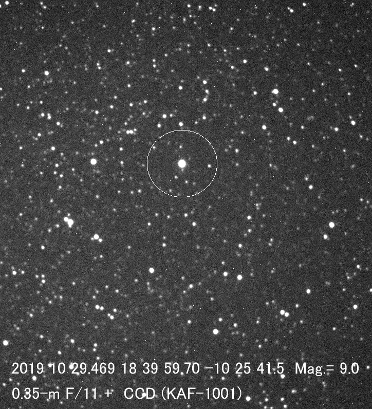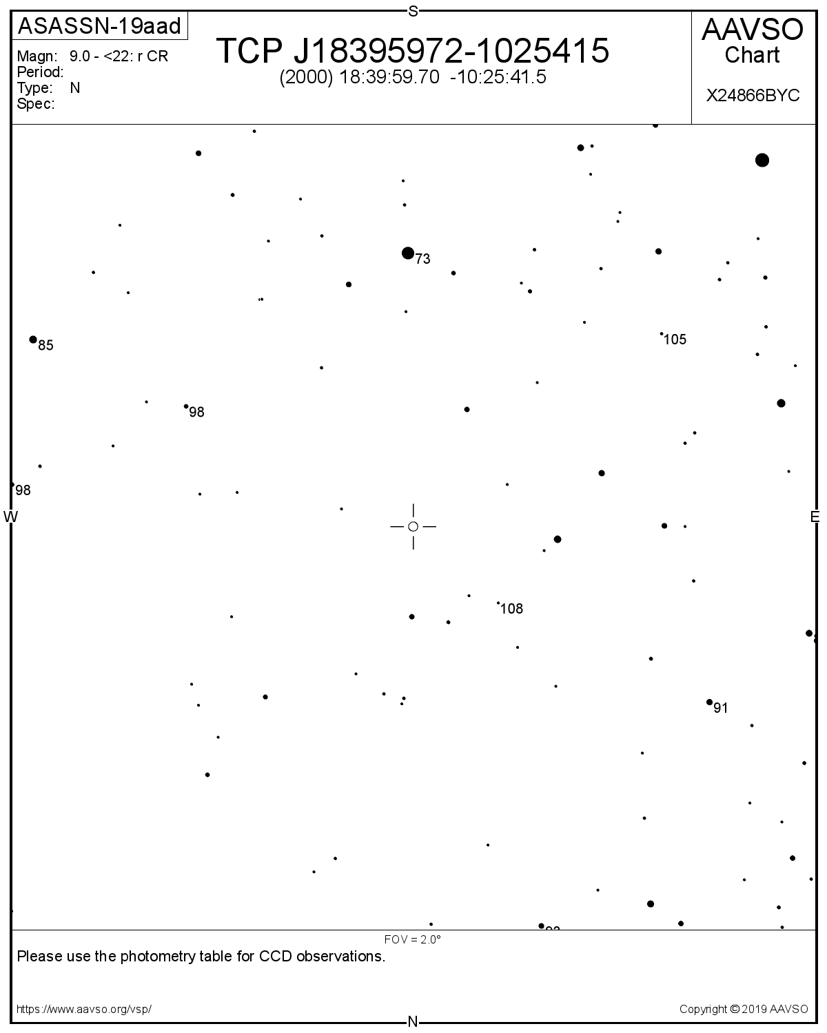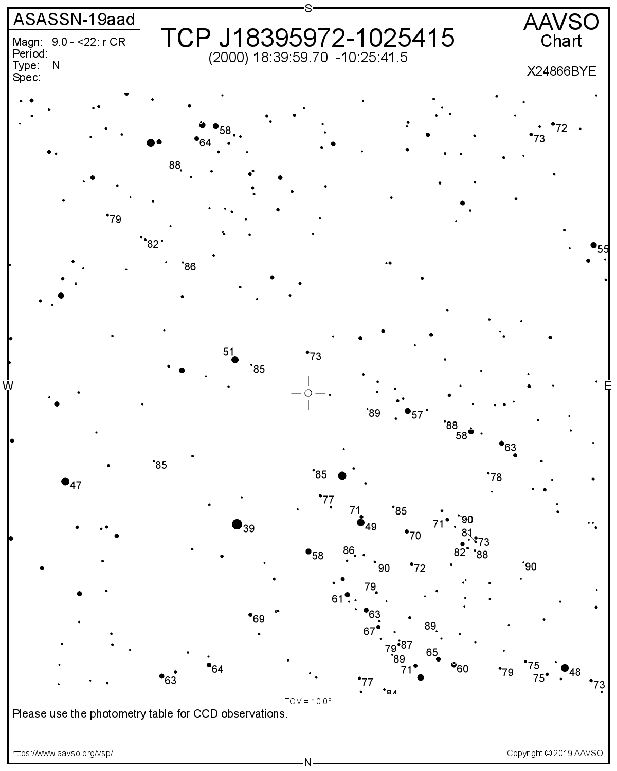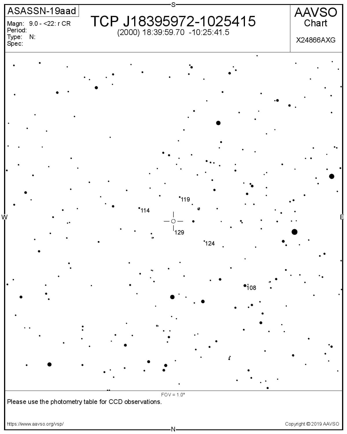 29 октября автоматическим обзором всего неба ASAS-SN в созвездии Щита была обнаружена вспышка возможной Новой, которая получила предварительное обозначение ASASSN-19aad (= TCP J18395972-1025415). На момент открытия объект имел блеск 9,4m, что позволяет наблюдать его даже в небольшие телескопы, несмотря на небольшую высоту над горизонтом. Согласно спектральным исследованиям объект является галактической Новой на ранних стадиях вспышки. Вполне возможно, что она еще добавит в яркости. Координаты Новой: α=18:39:59.825 δ=-10:25:41.92 https://wis-tns.weizmann.ac.il/object/2019tpbhttps://www.aavso.org/vsx/index.php?vie ... id=1499545Карты окрестностей Новой и фото Коичи Итагаки.  Просмотров: 1941