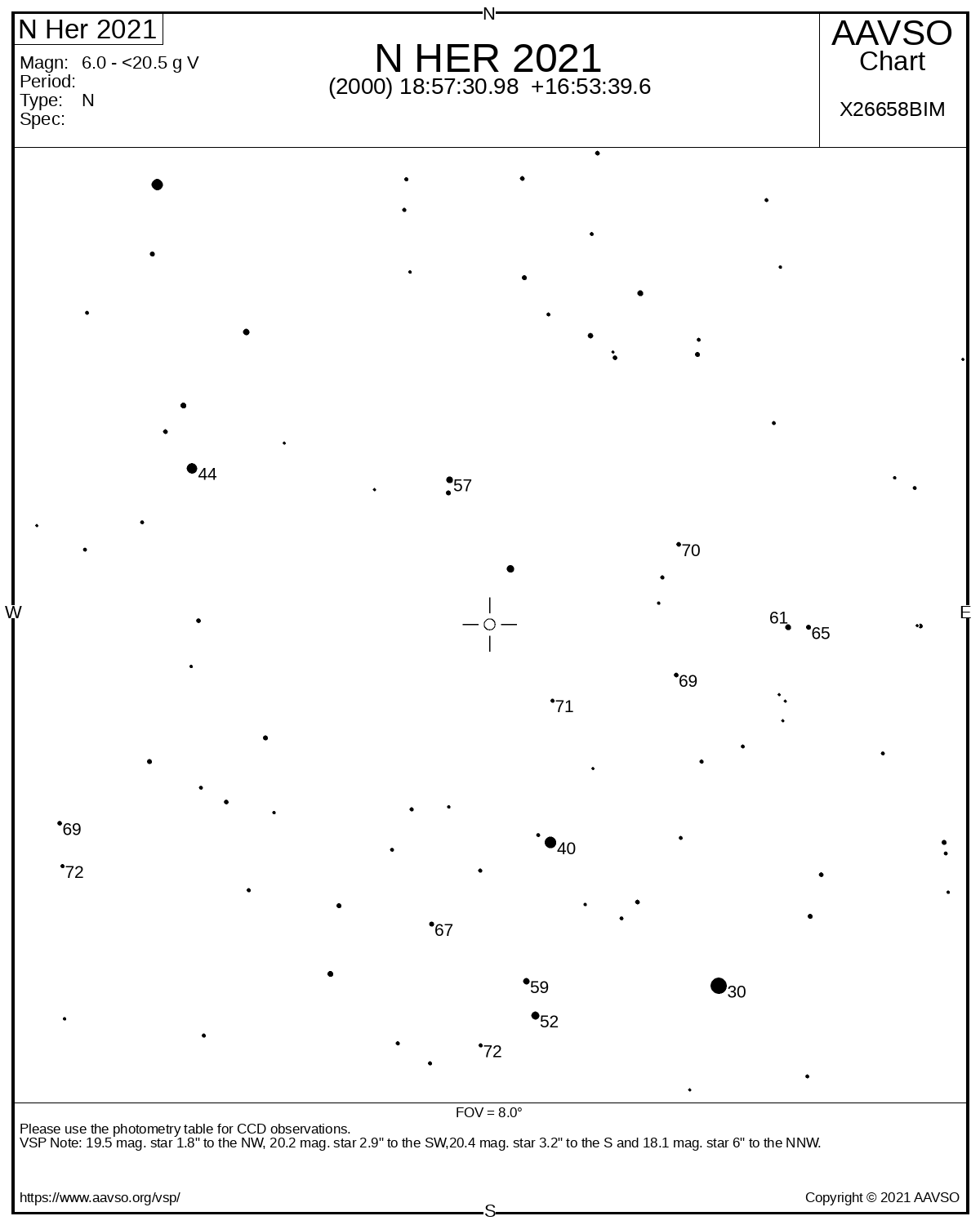 На момент открытия её блеск составил целых 8,4m. Координаты :R.A. 18h57m30.95s, Decl. +16°53'39.6" (J2000.0). Судя по всему родительской звездой является Gaia 4514092717838547584 с блеском 17,5m. Новая получила обозначение N Her 2021. Ее блеск быстро вырос до 6,2m, что при благоприятных условиях позволяет различить её невооружённым глазом. К сожалению нахожусь сейчас без оптики при светлом северном небе.... Карта окрестностей Новой Геркулеса.
