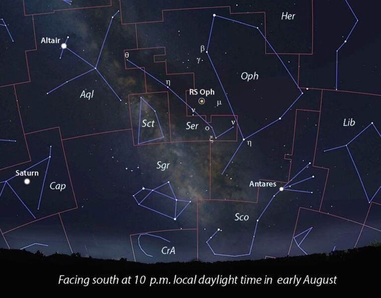 Она находится в восточной части созвездия Змееносца и видна сейчас по вечерам в южном и юго-западном направлении. Обычно ее блеск находится вблизи 12m, но вечером 8 августа ирландский любитель астрономии Кейт Гири обнаружил ее при блеске около 5m. В максимуме она достигла 4,5m и сейчас будет сравнительно быстро терять в блеске, примерно на 2m в неделю. Так что, в ближайшее время ее можно будет увидеть даже в малые телескопы и бинокли.