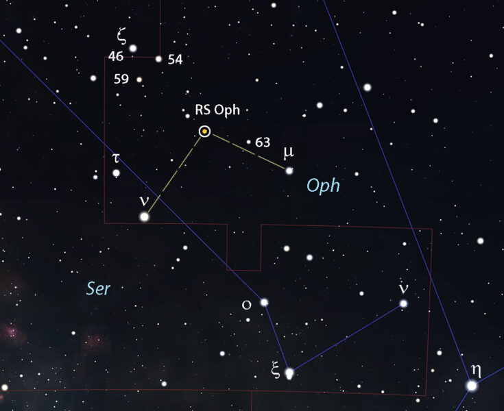 RS Oph - одна из немногих известных повторных Новых испытала очередную вспышку и стала видна невооружённым глазом!