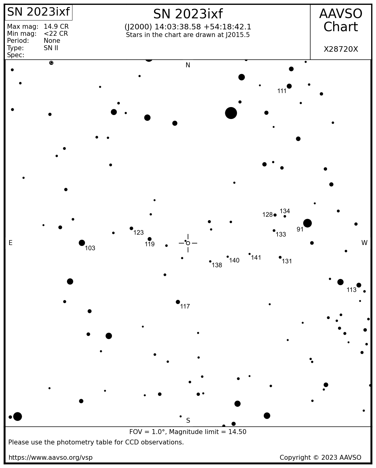 Блеск сверхновой был примерно посередине между блеском звёзд сравнения 10,3 и 11,9m и примерно равен блеску звезды 11,1m, расположенной несколько в стороне от сверхновой.