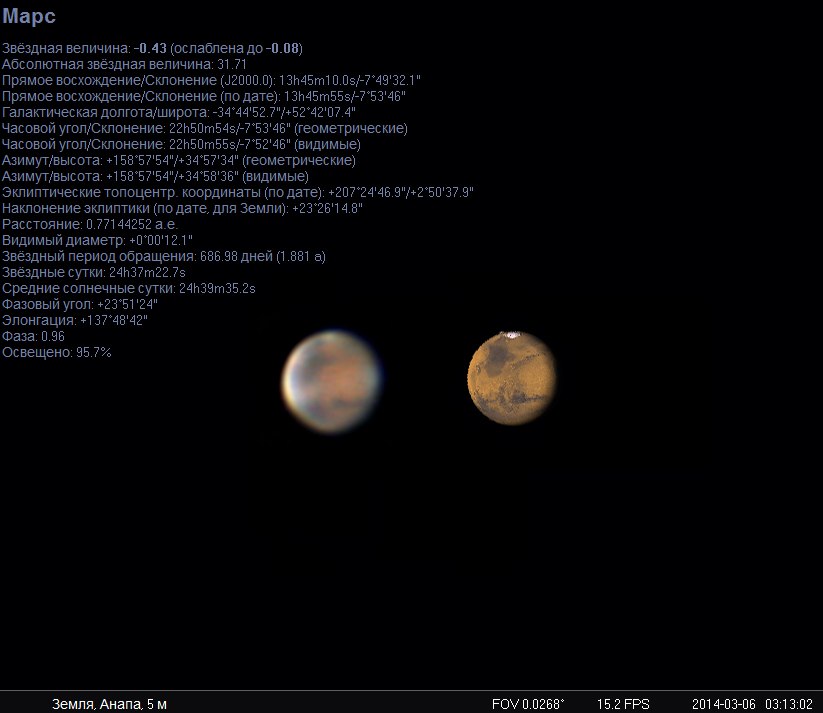 Марс отличный!+ Добавляйте кол-во кадров, по Марсу на азимутале можно делать ролик до 1 мин, и можно увеличить масштаб. По Регистаку - здесь описание на русском работы с программой viewtopic.php?f=8&t=11426 Сама же программа на русском - была старая версия по-моему третья, если нужно - пишите, поищу в архивах, но возможностей в ней гораздо меньше чем в пятой версии.