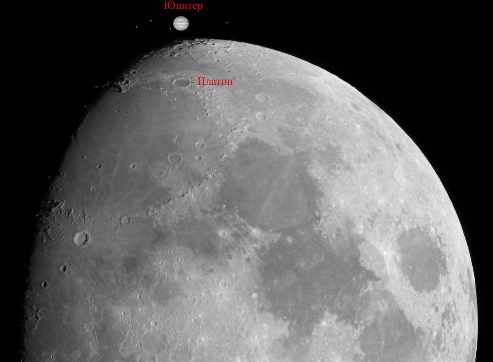 Самый простой способ оценить масштаб – по Луне, самому доступному небесному объекту. Луна имеет угловой диаметр около 30 угловых минут или около 1800 угловых секунд. Юпитер в противостоянии имеет диаметр около 48 угловых секунд, что практически совпадает с угловым размером известного лунного кратера Платон.  Просмотров: 26340