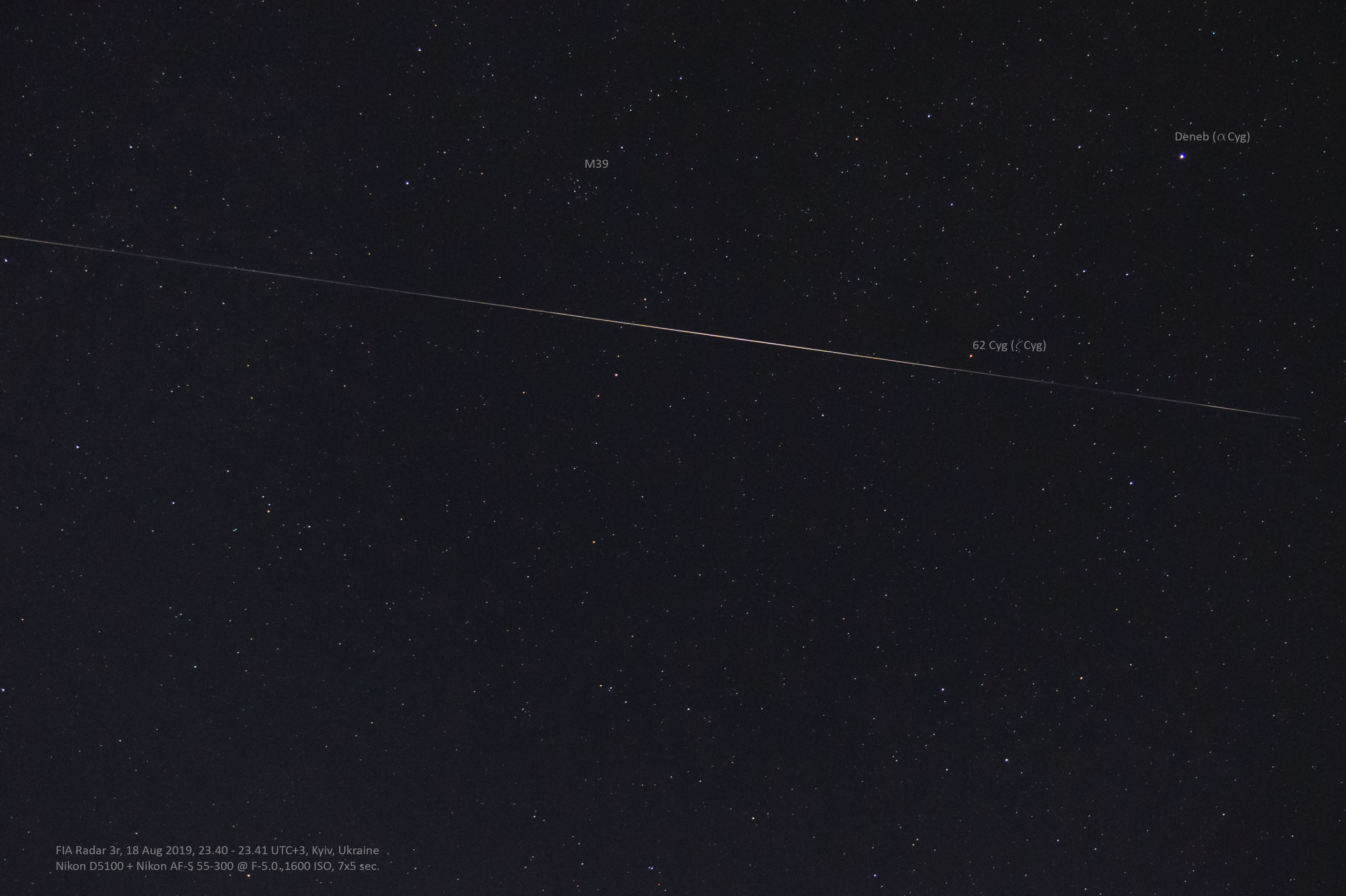 Пролет американского спутника радиолокационной разведки FIA Radar 3r (NSSDC ID: 2013-072P) Сфотографировано в г.Киев 18.08.2019 г. Фотоаппарат: Nikon D5100 Объектив: Nikkor 55-300 мм Неподвижный штатив Параметры: 55 мм | f-5.0 | ISO 1600 7х5 сек.
