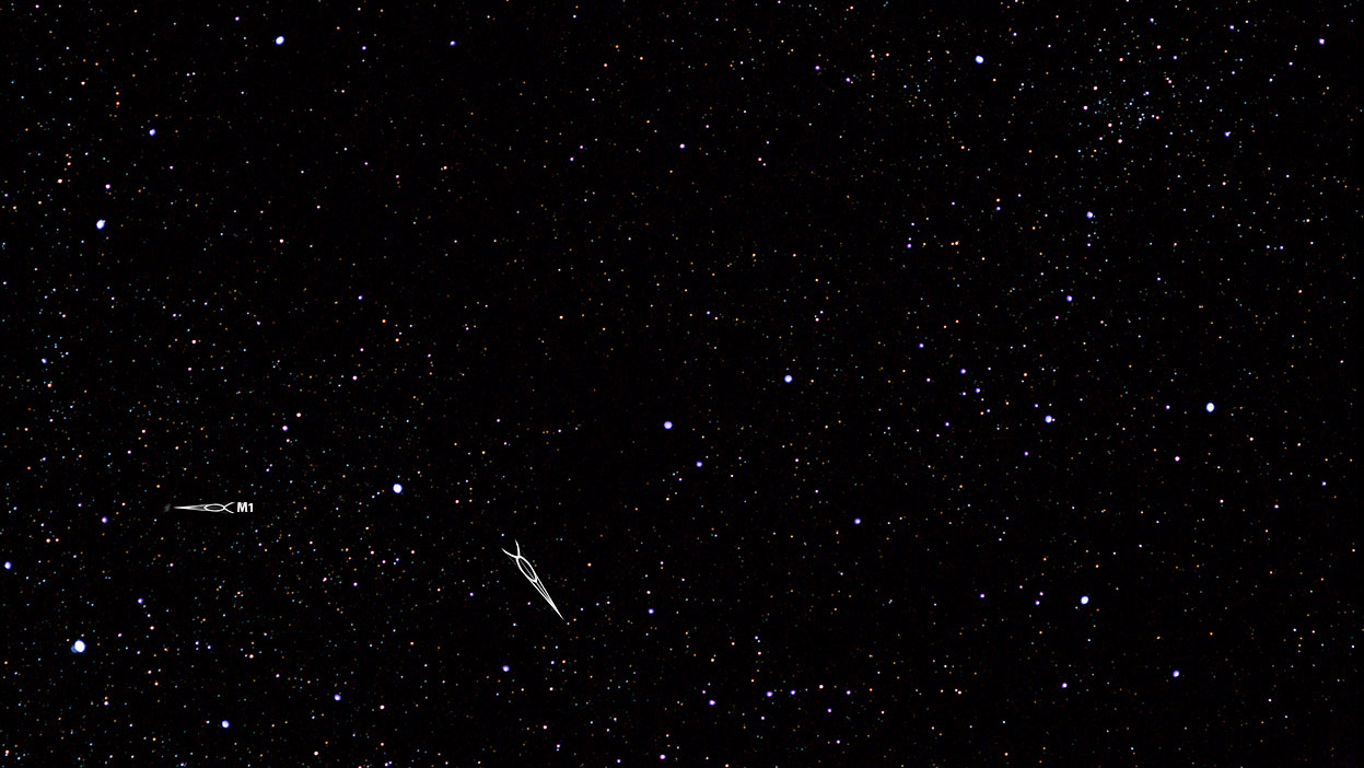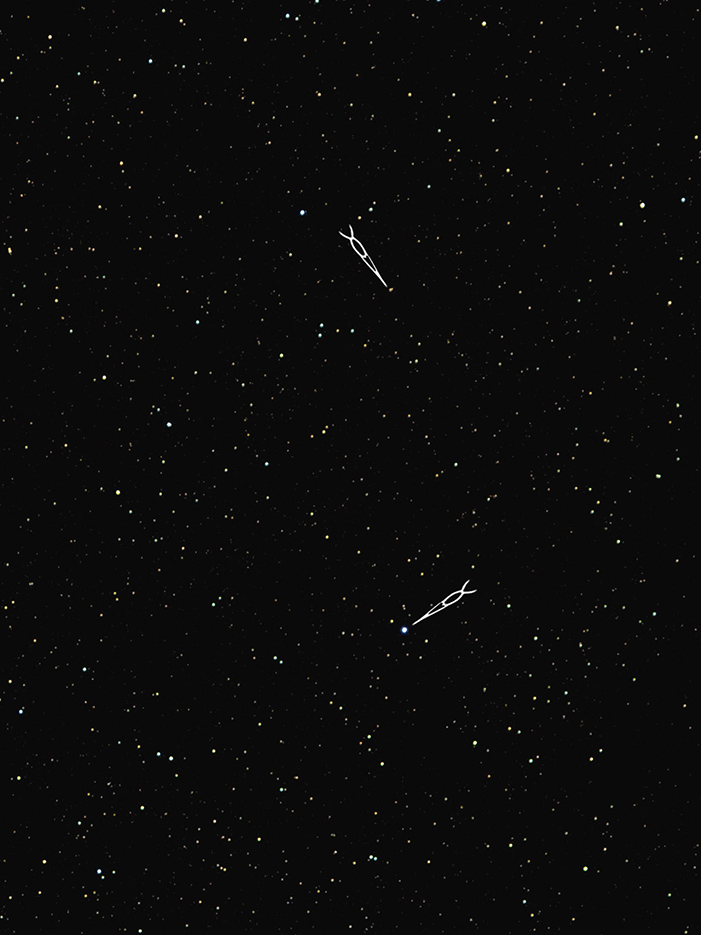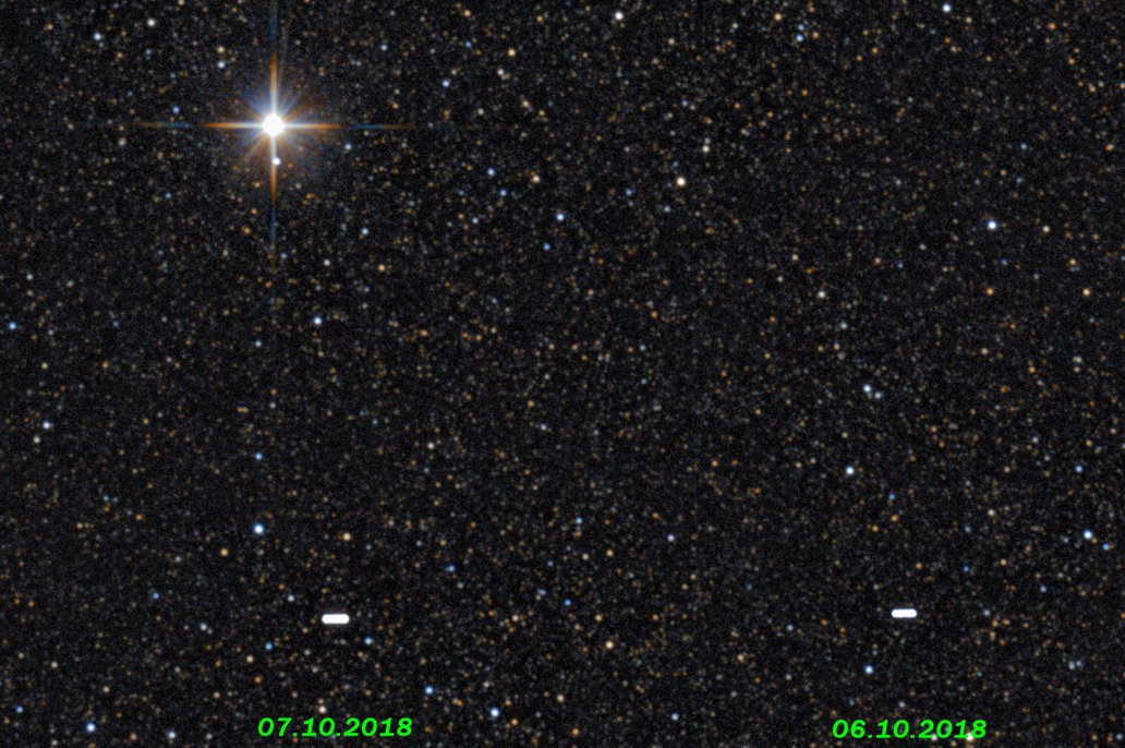 Продублирую и в этой теме Начало здесь viewtopic.php?f=8&t=12693&start=230#p60547 Прохождение астероида Веста около оранжевого гиганта λ Стрельца или Каус Бореалис. Движение астероида за 45 минут через сутки, 6 и 7 октября 2018 года. Эти объекты имеют склонение около минус 25 градусов. И во время съемки находились на высоте около 10 градусов над горизонтом. Балкон многоэтажки, красная зона засветки. Рефлектор Ньютона SW130/650 + комакорректор SW на EQ5 с приводом, Canon 550D, iso6400. Север вверху.