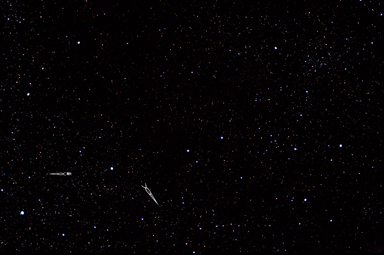 Астероид Эрос в небольшом пролёте от М1. Параметры съёмки: 5 февраля 2019; 20-19 мос; Canon 1100d; 135/3.5; ISO 800; 5х30с; DSS+ FITStacker+ Ph.