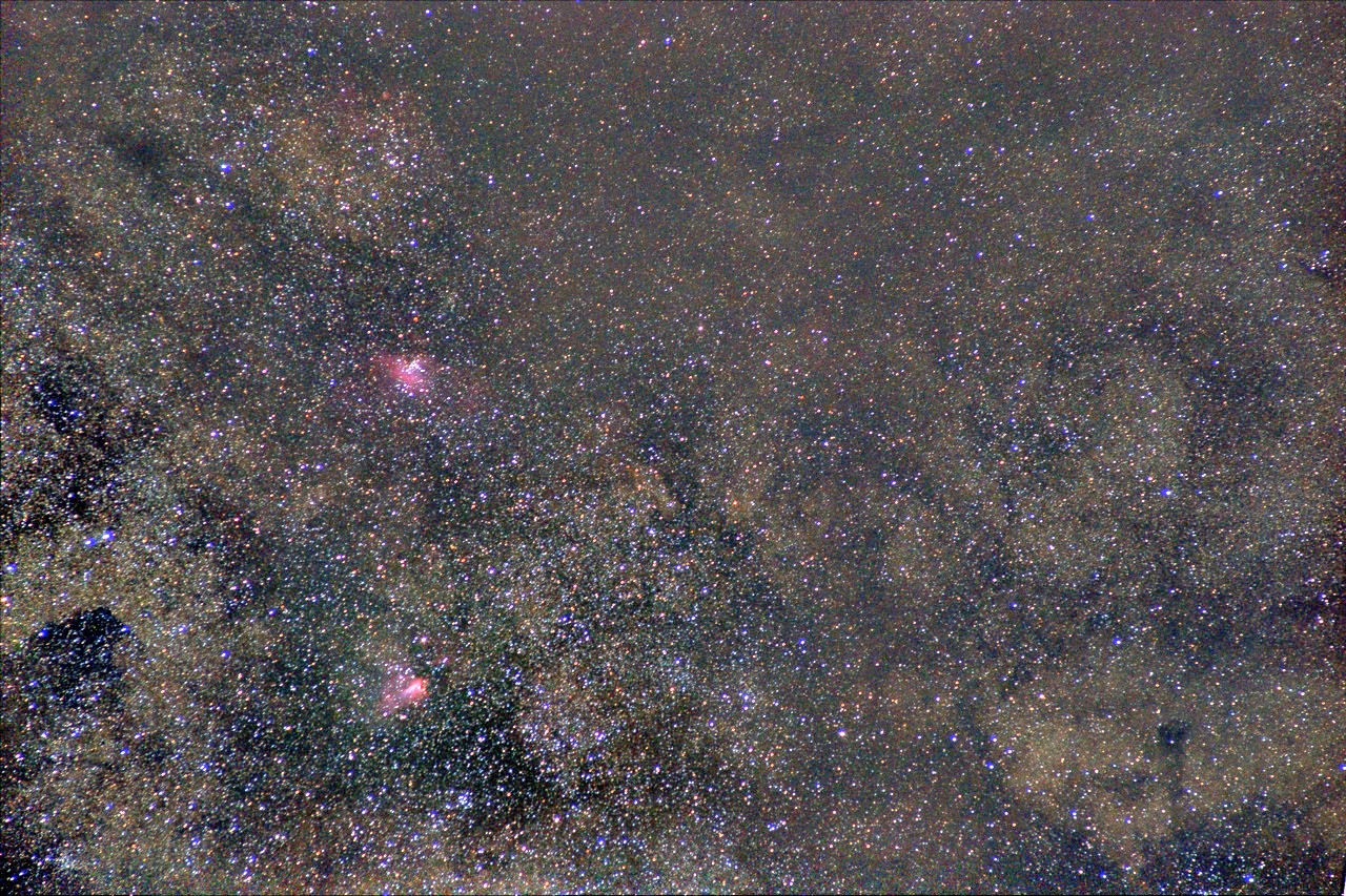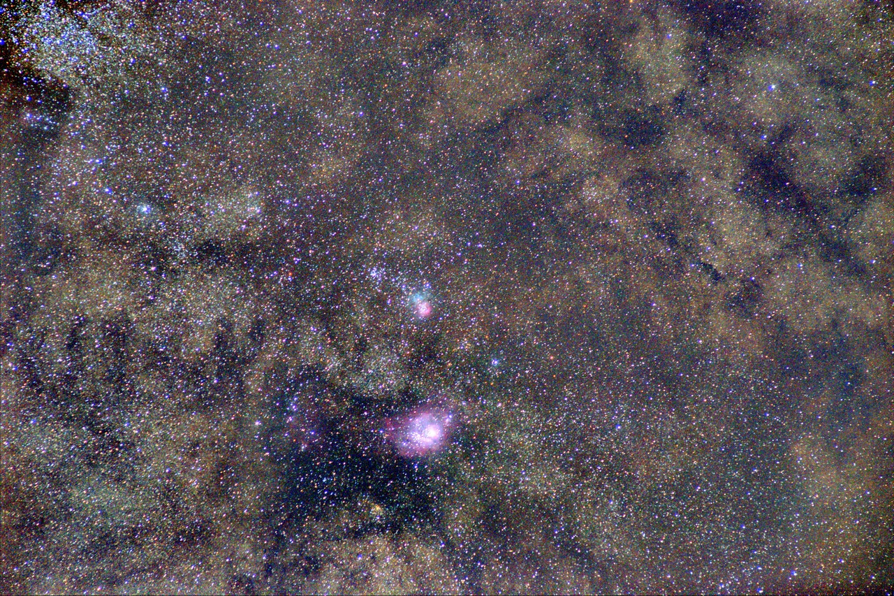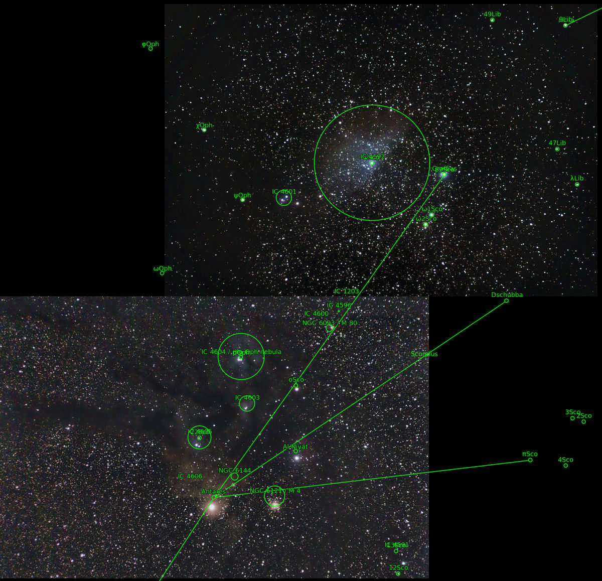 Ради эксперимента попробовал объединить два снимка по Скорпиону, получилось не очень, не смог обработать два кадра одинаково, да и совместить грамотно не получилось. Все снято на Canon 30Da 55-250(135) F 5.0 монтировка-EQ2 ic4592- 10x3 минуты, iso 1600 Окрестности Антарес- 30x1 минуту(6ф+5б), iso 1600 DSS/FW/FS засветка зеленая, балкон.