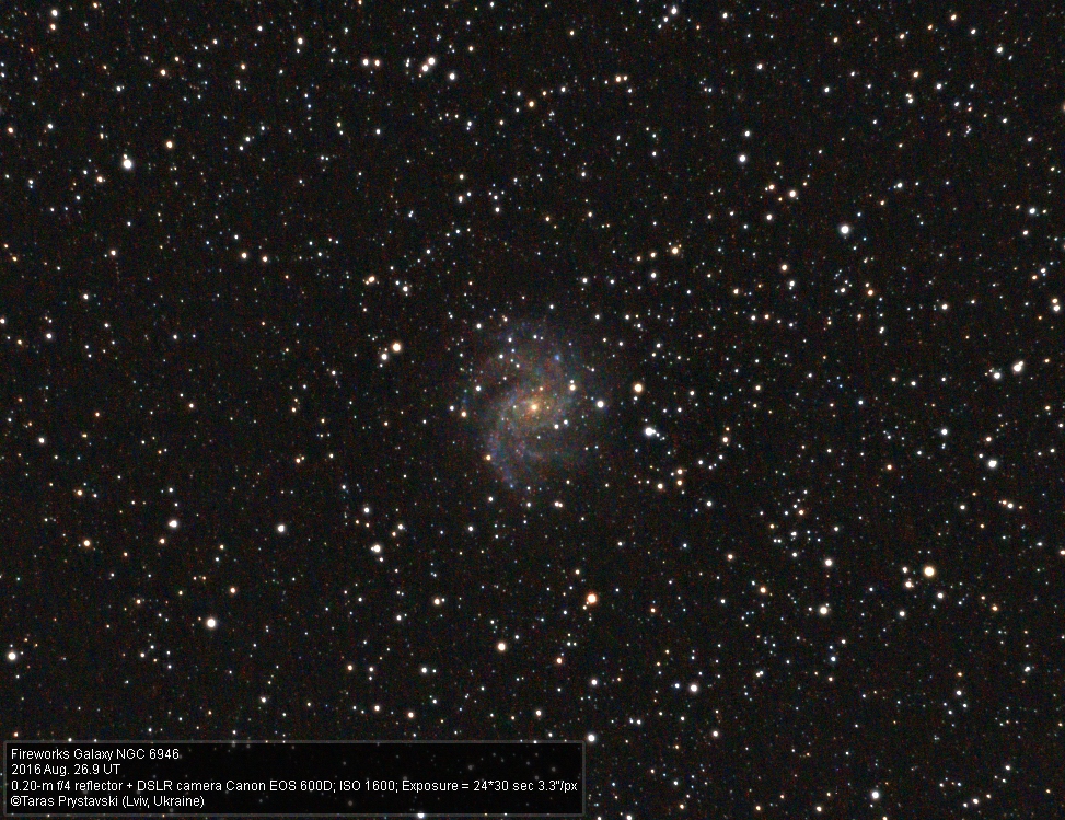 Спробував зняти галактику. Галактика Феєрверк NGC 6946 - гарний об'єкт для астрофото, добре видно спіральні рукави. Тут трохи попрацював над зменшенням шумів. Шуми є, але, здається, не так багато, як в моїх попередніх роботах.