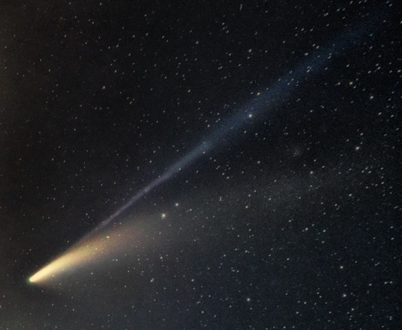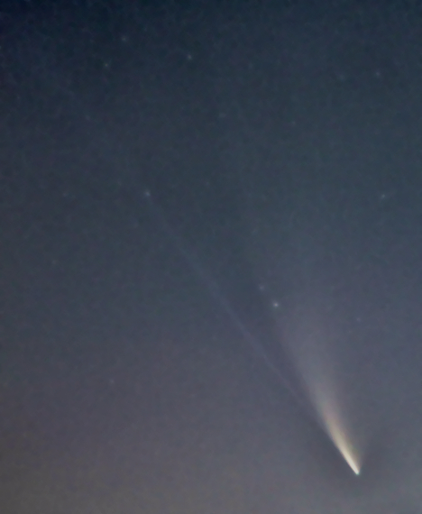 Позвольте и мне отметиться. Сначала пронаблюдал комету и сделал фото общего плана (объектив 50мм). После этого попробовал заснять более крупно ядро кометы через телескоп. Но оказалось что комета довольно быстро движется. После сложения 20-и кадров получил заметные треки звезд (может потом попробую почистить).