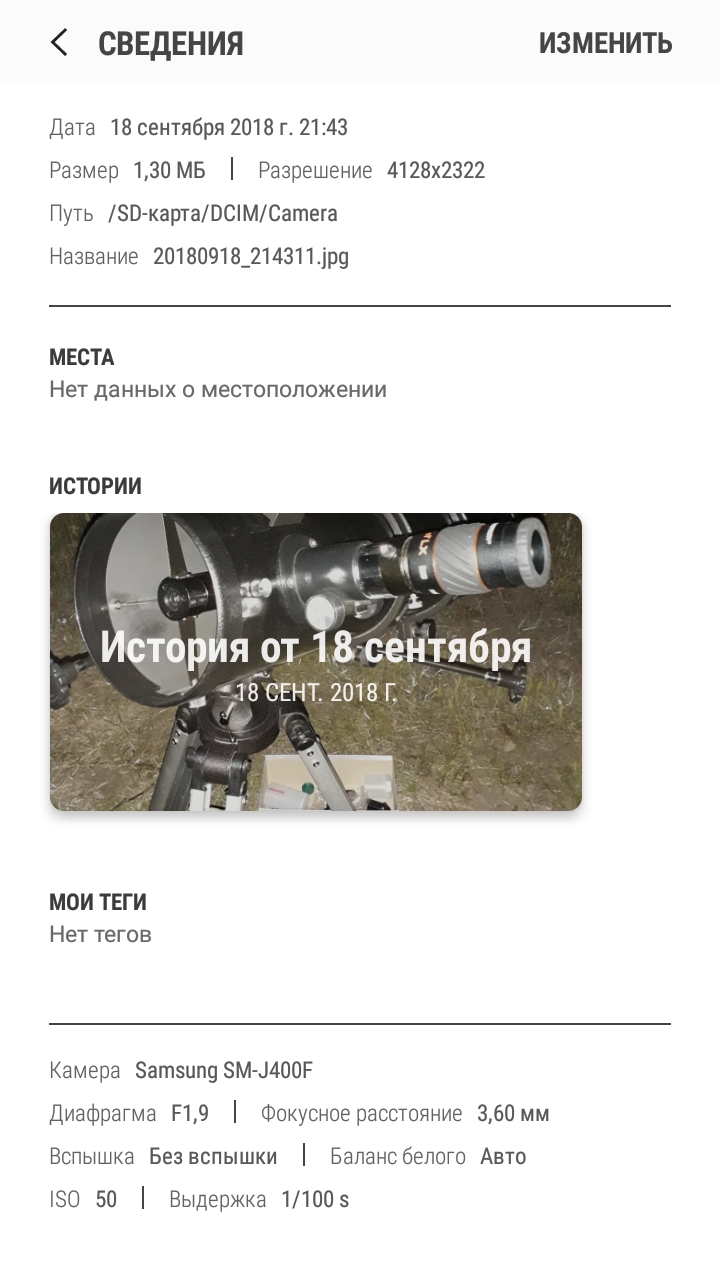 Добрый вечер! Спасибо за плюсик. Телескоп Arsenal 130/650EQ2 . Родной окуляр 17мм Plossl и линза Барлоу только пришла "свежая" в этот день Celestron omni 2x. Тоесть усиление около 76х. Смарт тоже "свежий" только купил ради камеры (вместо китайца CUBOT R9 где фокус живет своей жизнью) Samsung galaxy J4. Камера 13мп мне понравилась. Игрался с режимами Авто, ручные (профессиональный) и ночь. То больше всего понравился режим "ночь". Держал в руках и задерживал дыхание. Крепеж для смарта еще не приехал. Пытался Юпитер, Сатурн и понял, что неееее выйдет)) Не видит камера. ISO тут макс. 800. Или скорей даже не это, а фокус не справляется. Добавили бы ручной, думаю что-то и вышло бы. Ну для смартфона это считают не нужным. Изучаю тему зеркалок в данный момент. Какую лучше б/у прикупить.