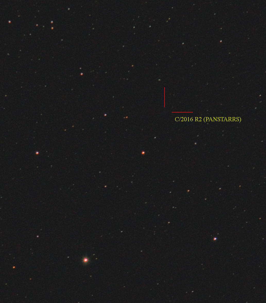 Комета C/2016 R2 (PANSTARRS) Сфотографировано в г. Киев. 08.01.2018 г. Фотоаппарат: Nikon D5100 Обьектив: Nikkor 55-300 мм Неподвижный штатив Параметры: Фокусное расстояние 140 мм F-4.8/ISO 2000 187х2.0 сек. Калибровка, выравнивание и сложение в программе DSS, фон в Fitstacker, доработка в Photoshop, кроп.