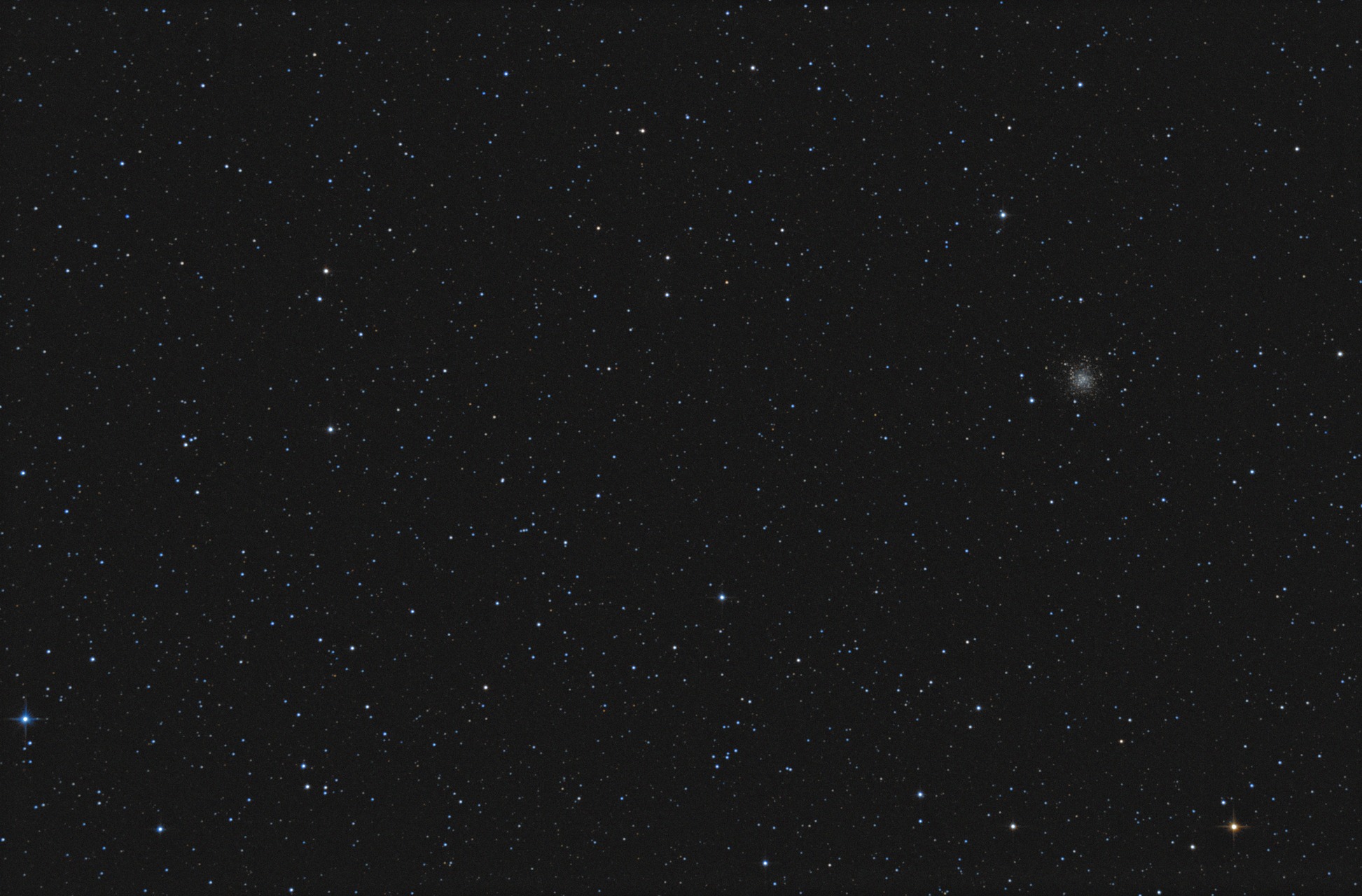 Еще два объекта Мессье в одном кадре. Созвездие Водолей. Шаровое скопление М72 справа, астеризм из четырех звезд М73 слева. Балкон многоэтажки, красная зона засветки. Рефлектор Ньютона SW130/650 + комакорректор SW на EQ5 с приводом, Canon 550D, iso6400, 178 кадра по 20 сек. Север вверху. М72 и М73 на широком поле - примерно 2 на 1,35 градуса. Масштаб 40%  Просмотров: 781
