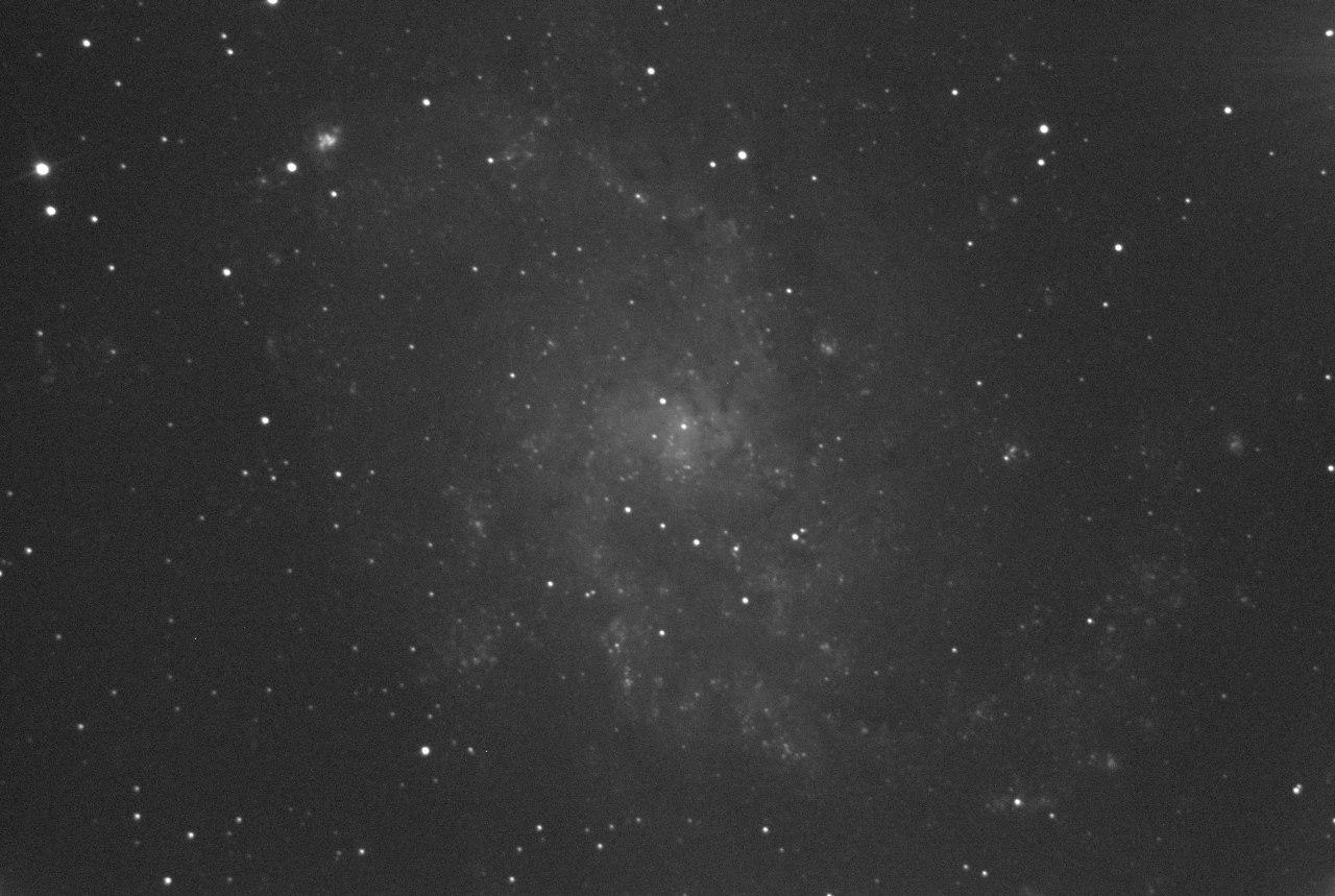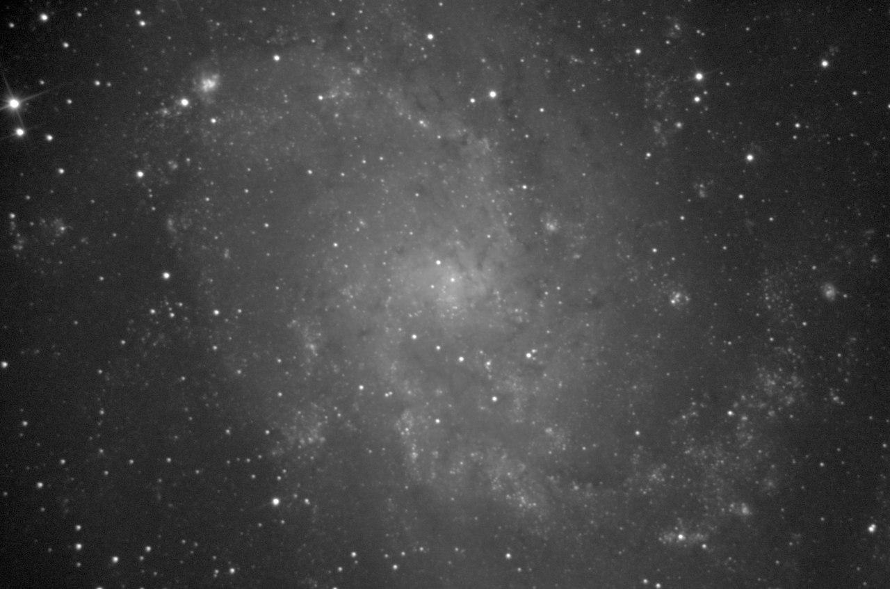 Спиральная галактика M33, NGC 598 типа Sc в созвездии Треугольника. Третья по размеру после Галактики Андромеды и Млечного Пути галактика местной группы.По диаметру в 2 раза меньше нашей галактики Млечный Путь. Диаметр галактики М33 около 50 тысяч световых лет. Расстояние около 2,7 - 3 млн. световых лет. Параметры съемки: 41 кадр по 180 сек. Телескоп SW150/750, камера ZWO ASI 178MM, фильтр Baader Planetarium Neodymium. Масштаб 40%.  Просмотров: 779