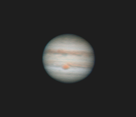 Юпитер от 10 июня. Dall-Kirkham, 265 mm, 1:21, Canon 550D, ЛБ 2х. Захват видео в Eos_Movrec-0.3.2. , 21,6 fps. Конвертация файла в VirtualDub. 2600 кадров сложено в AutoStakkert (Drizzle 3). Пост-обработка в Astra Image 3.0 Pro. Масштаб снимка 50%. Юпитер заметно прибавил..Угловой размер 45,7", V= -2,56. Высота 22*.