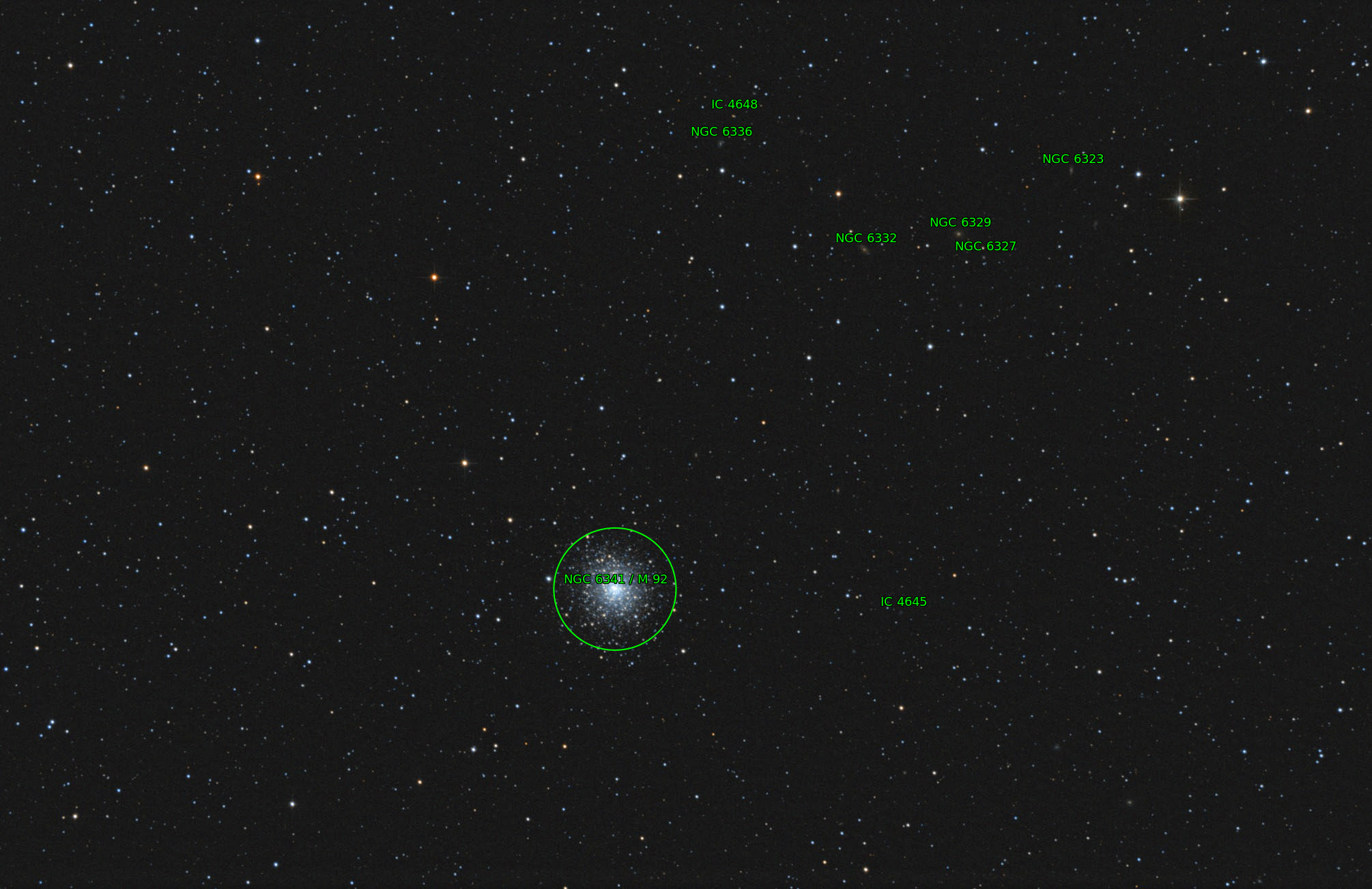 Игорь Астроскоп писал(а): Размещу в этой теме  Кроме основного объекта, шарового скопление М92, в поле зрение можно найти еще несколько объектов из каталогов NGC, IC и даже PGC. Именно этим и обусловлено такое кадрирование.