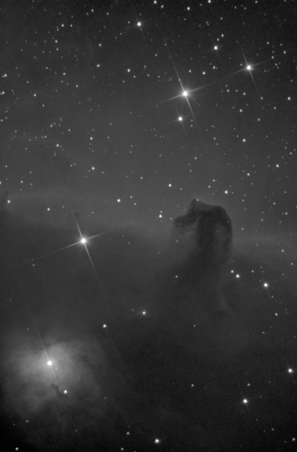 IC434 - темная туманность "Конская голова" в созвездии Орион. Это одна из наиболее известных туманностей, которая видна как темное пятно на фоне свечения водородных облаков. Свечение облаков вызвано излучением яркой звезды ζ Ориона. Темный фон туманности "Конская голова" возникает в основном за счет поглощения света плотным слоем пыли. Размер туманности около 3,5 световых лет, расстояние около 1300 световых лет. Туманность является частью огромного газопылевого комплекса звездообразования. Впервые туманность была обнаружена в 1888 году на фотографиях Гарвардской обсерватории. В левом нижнем углу расположена туманность NGC2023. Фото от 18.11.2018 года. Телескоп: ньютон SW150/750, камера ZWO ASI 178MM. В сложении 45 кадров по 120 сек. Масштаб 50%. Похоже от холода, оправой пережало зеркало. Поэтому форма звезд несколько пострадала. Да и гид несколько корявил. Но решил не заморачиваться по этому поводу. Скоро начнутся настоящие морозы, и сезон закончится. Так что рад, что хоть так получилось.  Просмотров: 1204