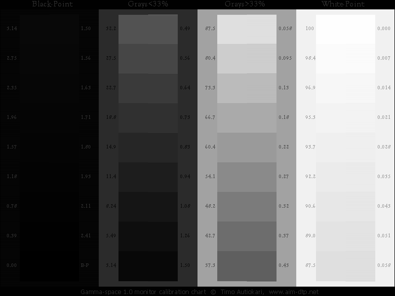 2 таблица баланс и контрст при верной настройке первый столбец практически чёрный, со второго начинаеться градиент в серую сторону, последний квадрат белый.