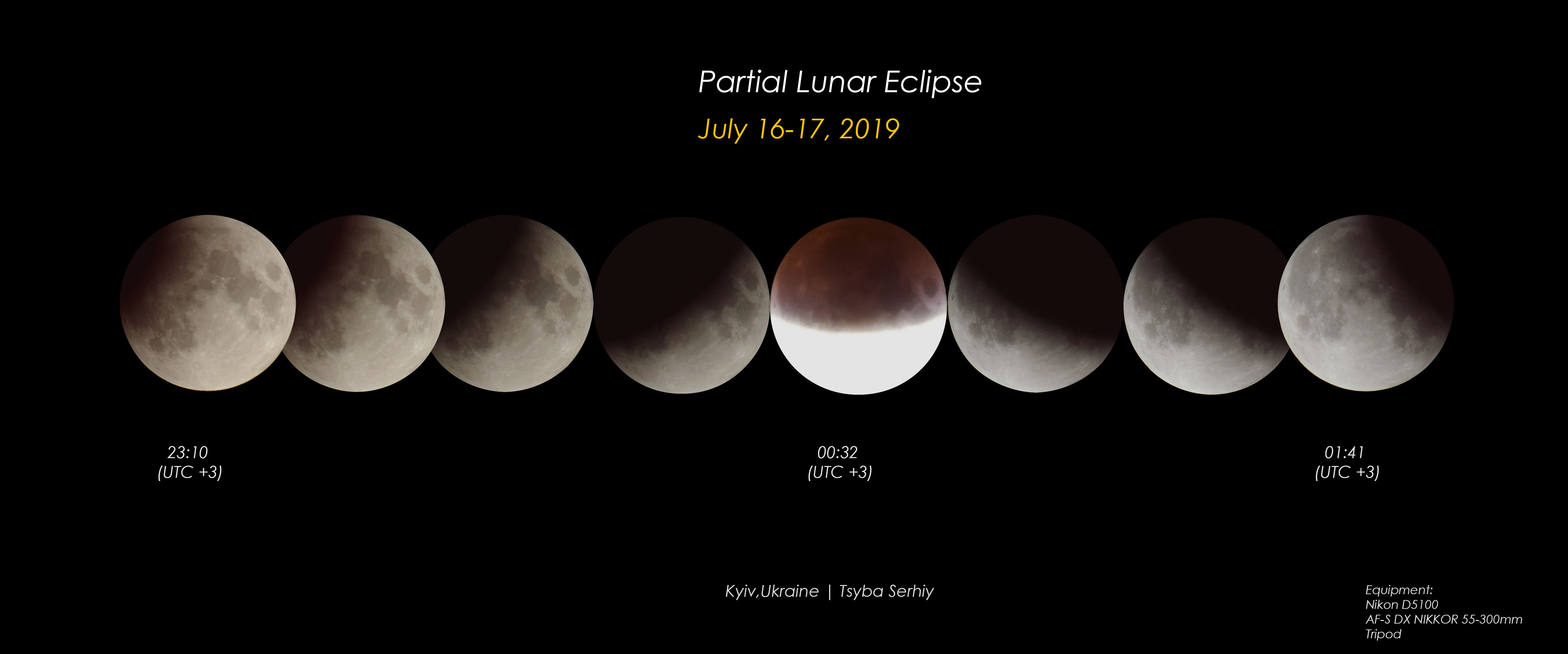Частное затмение Луны Сфотографировано в г. Киев. с 16.07 по 17.07.2019 г. Фотоаппарат: Nikon D5100 Обьектив: Nikkor 55-300 мм Неподвижный штатив композитное фото, кроп.