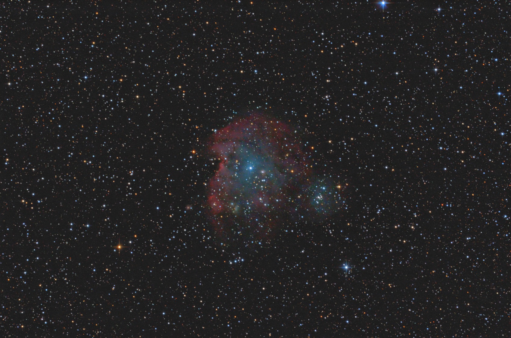 Алексей Локотков писал(а): Игорь Астроскоп писал(а): Голова Обезьяны - эмиссионная туманность на фоне рассеянного звездного скопления (NGC2174/2175). Расположена в созвездии Орион на расстоянии 6400 световых лет, интегральный блеск около 7m, видимые размеры 40'×30'. Результат шести фотосессий в марте и апреле 2020 года. Балкон в Харькове, красная зона засветки. EQ5, SW130650pds, Canon 550d, всего 700 кадров по 30 сек на iso3200. Поле зрения 2,15 на 1,42 градуса, север внизу, масштаб 33%. NGC2174_2020-03-24--26+04-12-17-28_700f30s32i_33%.jpg Контур головы обезьяны, однозначно. Кадр супер !  Шедевр!