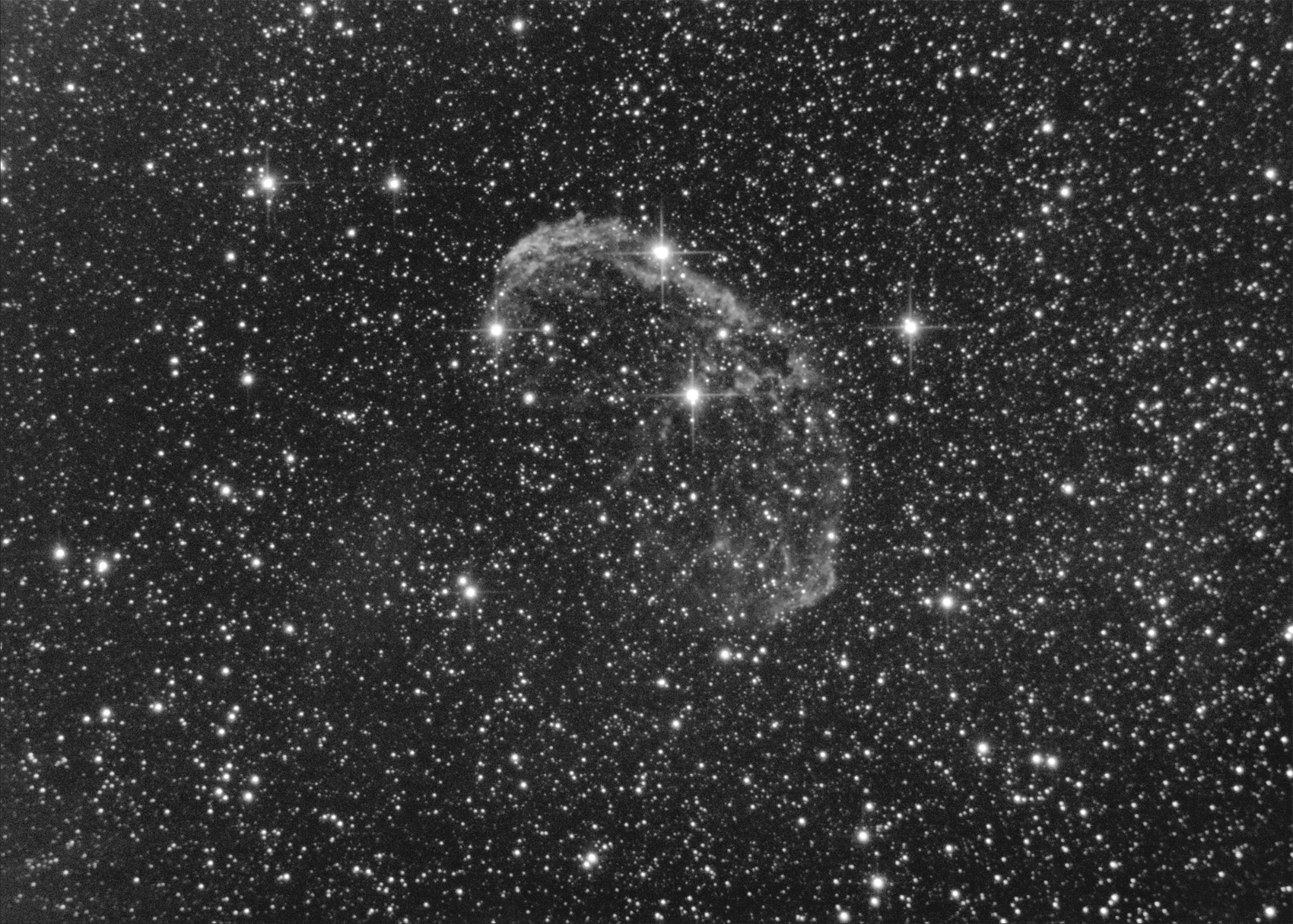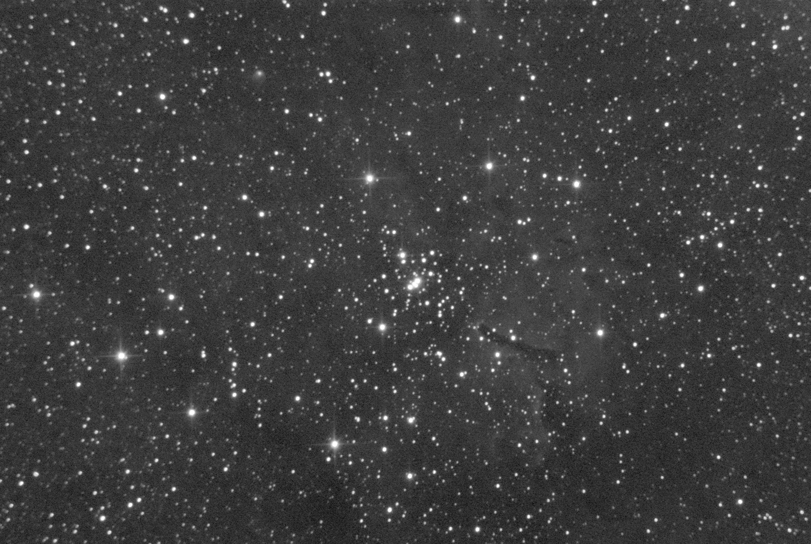 Очень интересными объектами оказались диффузные водородные туманности. Это возможность снять нечто необычное, при этом в приличном масштабе на небольшой фокус. Кроме того это, в большинстве своем очень тусклые объекты, и это вносит дополнительный азарт, особенно для съемки в условиях города. Не самых худших, но тем не менее. Несколько последних ночей были посвящены съемке одного из таких объектов, а именно рассеянному скоплению NGC6823 окруженному вессьма слабой водородной туманностью. Этот объект находится в созвездии Лисички, не далеко от планетарной туманности М27. Снимал три цветных канала, но получить адекватный цвет не удалось. По полтора часа на канал - маловато. Только в красном удалось проработать туманность. В зеленом и синем, не было и намека. Поэтому решил выложить монохромный вариант. Итого в сложении: R - 16 кадров по 300 сек. G - 16 кадров по 300 сек. B - 20 кадров по 300 сек. Общее накопление: 3 часа 20 минут. Место съемки: улично-балконно-оконная обсерватория.Оборудование: Ньютон SW BKP114/500 задиафрагмированный до 90 мм. Камера ZWO ASI 178MM. Отсекающий фильтр + CCD RGB фильтры.  Просмотров: 1916
