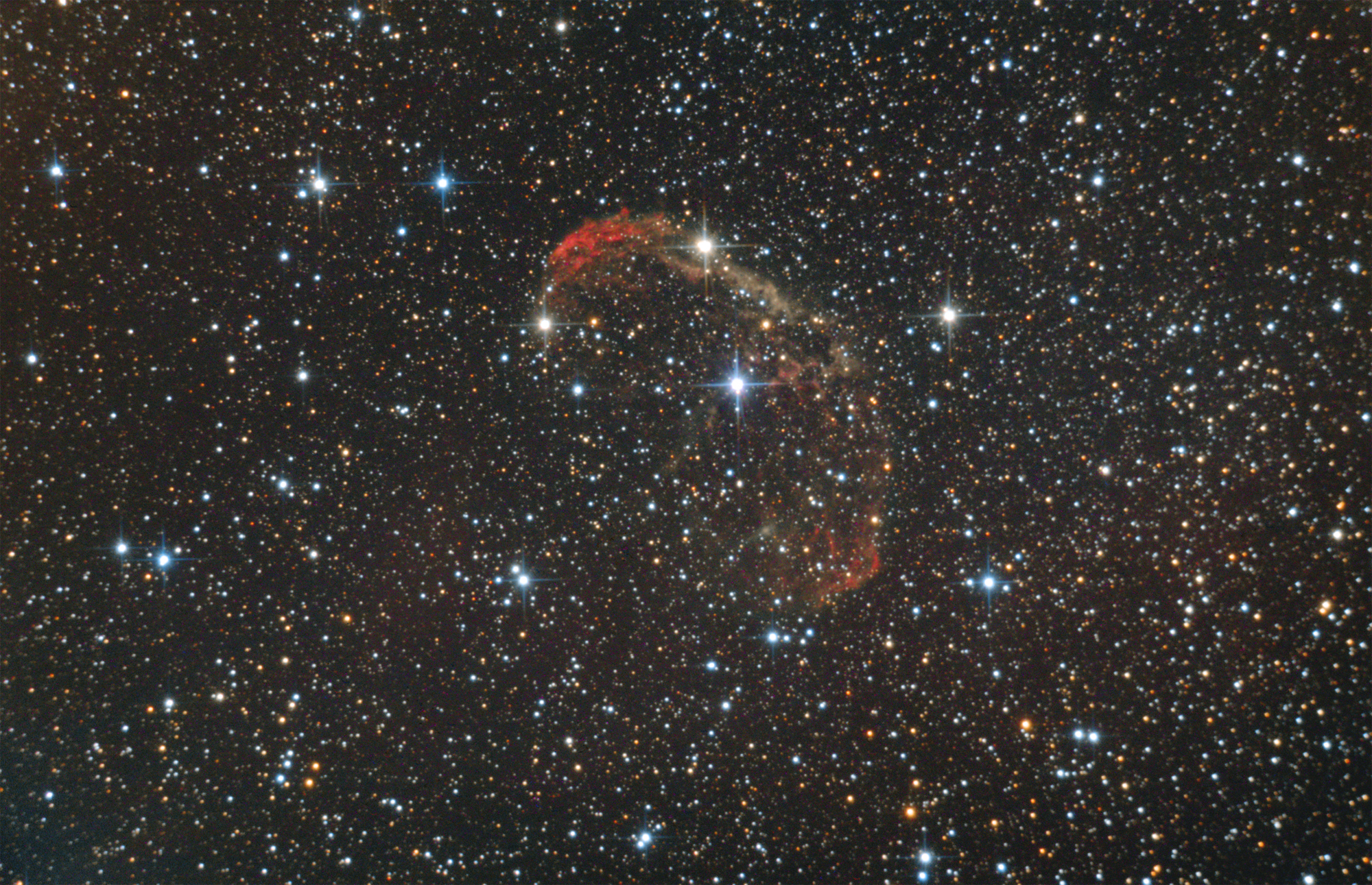 Михаил Астроскоп писал(а): Сегодняшний подход к туманности NGC 6888 или "Полумесяц" - эмиссионная туманность в созвездии Лебедя. Расстоянии около 5000 световых лет от Земли. Размеры туманности составляют примерно 25 на 18 световых лет. Телескоп SW 114/500 задиафрагмированный до 90 мм., камера ZWO ASI 178MM. Фильтр Baader Planetarium NEODYMIUM + красный CCD фильтр. В сложении лишь 18 кадров по 360 сек. Общее накопление 1 час. 48 минут. Очень короткие сейчас ночи. Север вверху. Масштаб 65%. Место съемки улично-балконно-оконная обсерваторияNGC6888g34crop65p.png Соглашусь с Андреем, чувство, что чего-то нехватает!