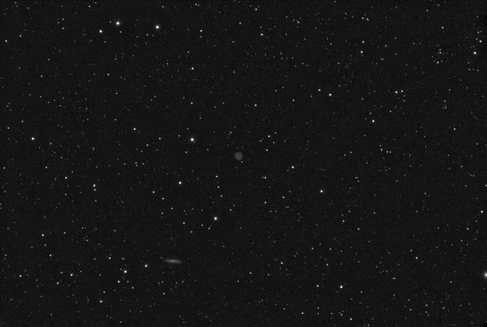 В рамках теста оборудования. М97 и М108 (планетарная туманность Сова и галактика) созвездие Большая Медведица. Интересно было посмотреть что получится по мелким объектам. Масштаб 50%. Пиксельный масштаб 7.35 arcsec/pixel. Поле около 3х2 градуса. Основное оборудование, как и прежде Юпитер 37А и камера ZWO ASI 178MM, плюс фильтры. Место съемки: улично-балконно-оконная обсерватория.  Просмотров: 717