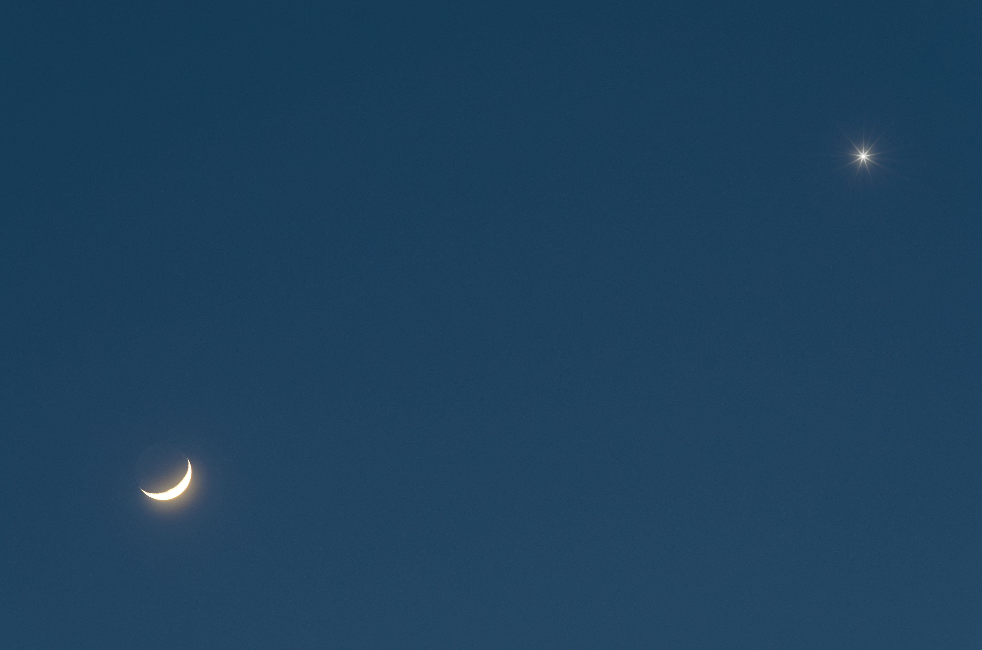 Луна и Венера 28.03.2020 р. г.Киев Nikon D5100 Nikkor 55-300 мм 135 мм | f 8,0 | ISO 250 | 1/1.3 сек. Лучи добавлены плагином в Photoshop