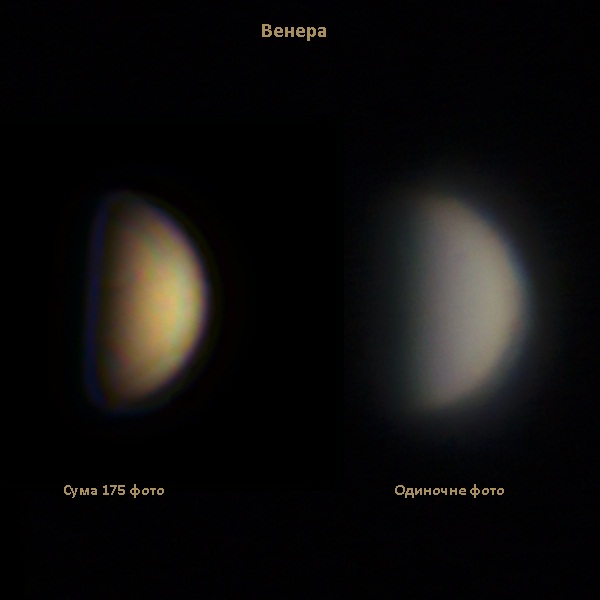 Михаил Астроскоп З цим складно не погодитись. Та в процесі обробки у мене виникли питання щодо деяких деталей на Венері, тому що коли я порівняв свій результат з і ншими, він якийсь інакший... А якщо врахувати ще те, що більшість досвідчених астрофотографів знімає в UV та IR діапазонах, то питань виникає ще більше, так як не має еталоного зображення Венери(або ж я просто не міг знайти), яке було б зрозблене у видимому діапазоні, схожим методом, відносно якого можна було б оцінити достовірність результату та якість проведеної роботи. Одиночник хоча б якось схожий на результати інших астрофотографів. Коли буде хороша астрономічна видимість, проведу зйомку астрокамерою, оброблю зібраний матеріал і порівняю результати.