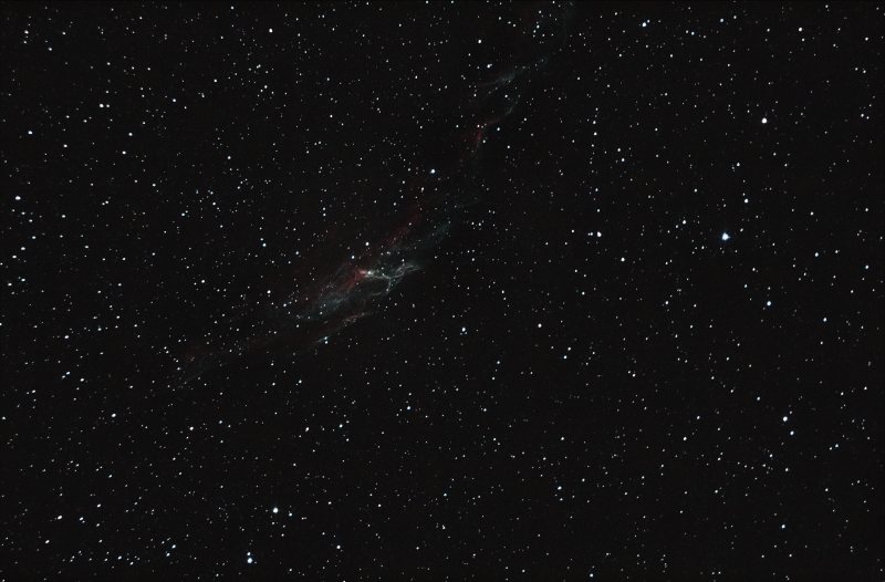Часть туманности Вуаль =) Снимал возле дома, в красной зоне засветки и Луна (во второй четверти.) В сложении 10 кадров по 30 сек. ISO 3200. Просто экспериментировал, что может получится в городе.