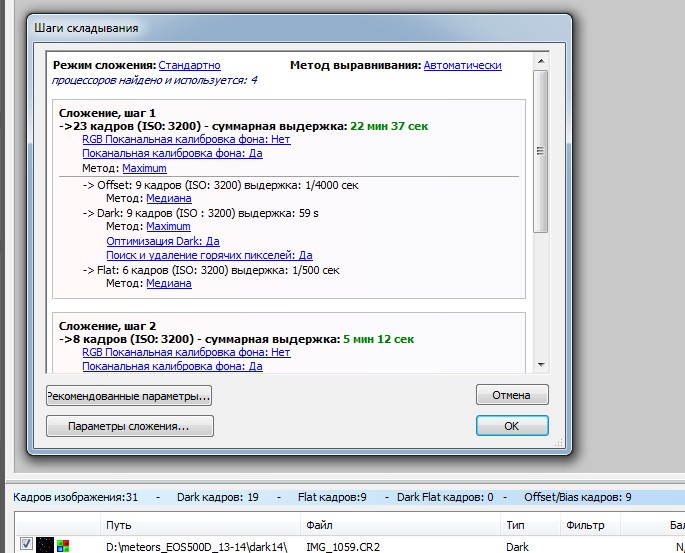 Игорь Астроскоп писал(а): Alex Angelsky писал(а): Поиск в инете дал результат, что тут наиболее полное описание по работе DeepSkyStacker. Ранее я обрабатывал другими программами, но возникла необходимость использовать ДСС. Как заставить эту программу использовать все предложенные ей кадры , независимо от "баллов" и пр.? Галочка и окошко использовать все 100% стоит. Но программа тупо игнорирует (по неизвестной причине ) также многие дарки, флеты и пр. Есть момент, что в фотоаппарате стоит " использовать поворот" и фастоун превьюшки видит по разному. Но ведь это РАВы , и в других программах не было из-за этого проблем. Уверен, что Ваша проблема в несовпадении/несоответствии установок съемки лайтов и калибровочных кадров. Поэтому ДСС и складывает, то что сооответствует друг другу. С этим можно "бороться": 1. Выделяем нужные кадры 2. Правой кнопкой мыши вызываем выпадаюший список 3. Выбираем пунк "Свойства" 4. Вручную устанавливаем НУЖНОЕ ОДИНАКОВОЕ ISO и выдержку на калибровочных кадрах После этого ВСЕ калибровочные будут задействованы. Ну я же не маленький мальчик, естественно все на одинаковом ИСО. Посмотрите на скрине, сколько я ему предлагаю, и сколько DSS хочет использовать