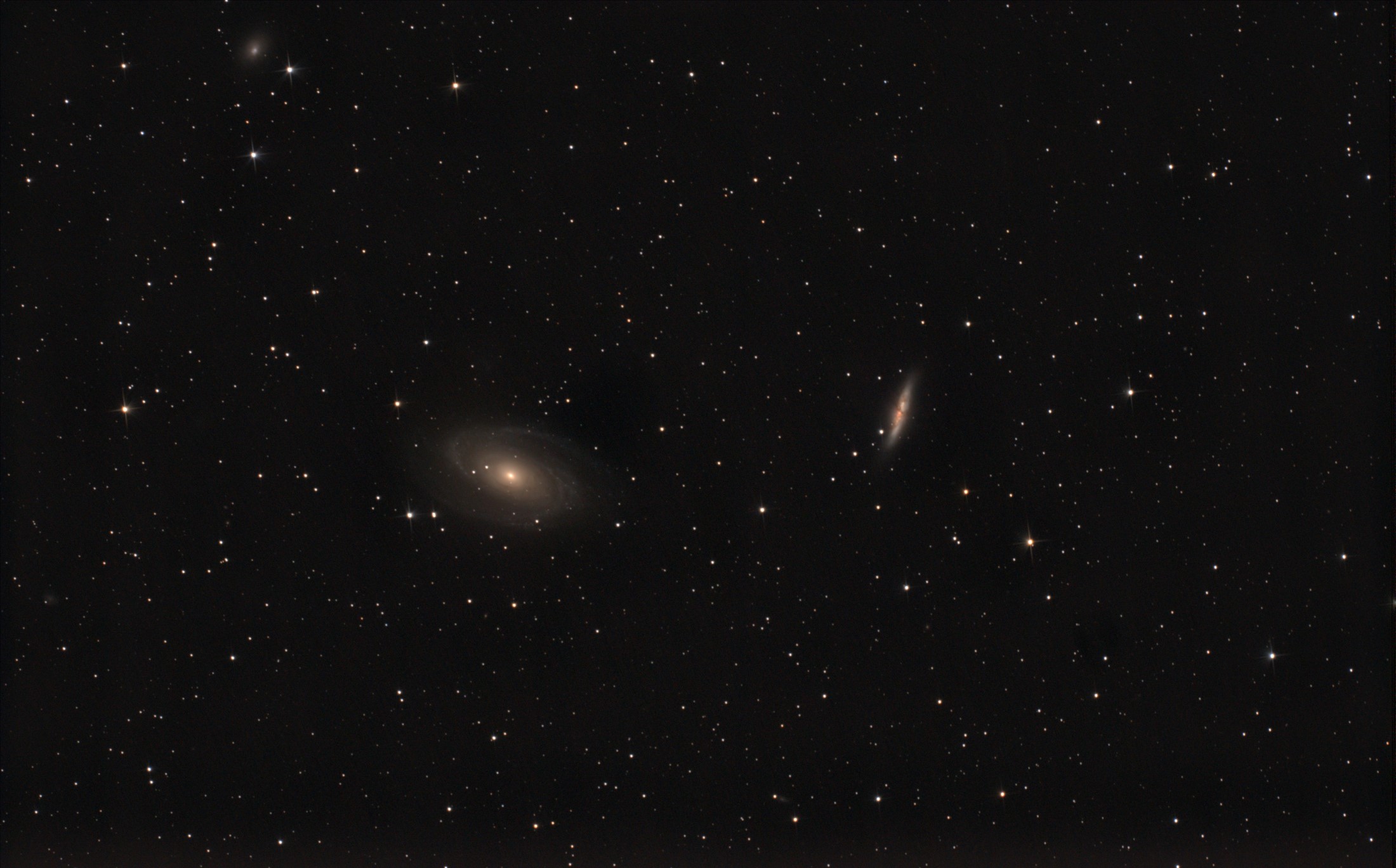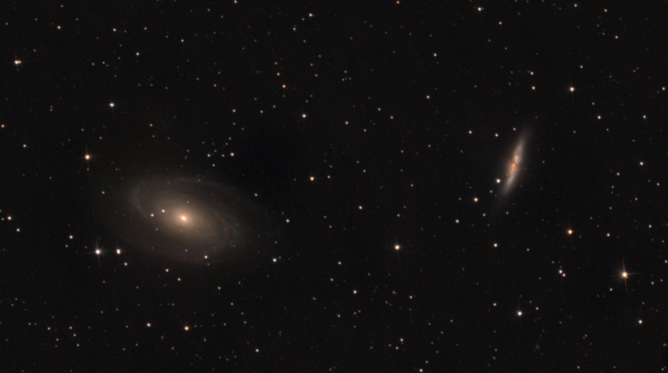 m 81 + m82,Съёмка 26.03.2020 Харьков, жёлтая зона засветки, луны нет, 27 кадра по 5 мин, Iso 800, Рефлектор Ньютона SW 130/650PDS, комакорректор SW,фотоаппарат Canon 77D, Монтировка SW HEQ-5 PRO,Гид ZWO ASI120MM mono, Гид телескоп Объектив Вега 12Б