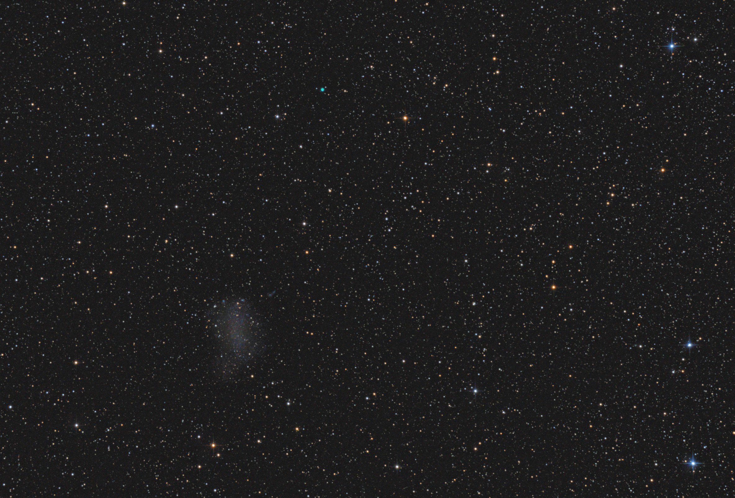 Галактика Барнарда или NGC6822 - карликовая неправильная галактика в созвездии Стрелец. Это один из спутников Млечного Пути. Объект весьма похож на Малое Магелланово Облако, но расположен в восемь раз дальше. Имеет угловой размер в половину диска Луны, однако из-за малой поверхностной яркости и отрицательного склонения малодоступен в северном полушарии. Выше и правее находится компактная, но яркая планетарная туманность NGC6818 или Малая Жемчужина. Шесть сессий в середине сентября 2020 года. Всего 557 кадров по 30 сек на iso3200. Монтировка SW EQ5 + привод, Ньютон SW130\650 + комакорректор SW, Canon 550D. Балкон в Харькове, красная зона засветки.  Просмотров: 750