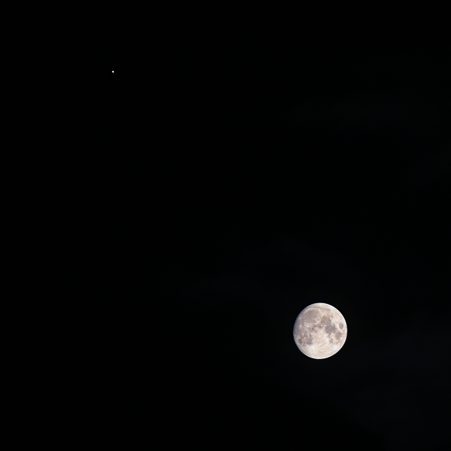 Соединение Луны и Юпитера 01.08.2020 Canon EOS 77D EF-S 18-135 IS USM 135 mm f/5.6 ISO 400 1/200-1/400 10 кадров с рук с разной выдержкой, сложены вручную по медиане в Photoshop. В западном полушари можно было наблюдать Луну между Юпитером и Сатурном.