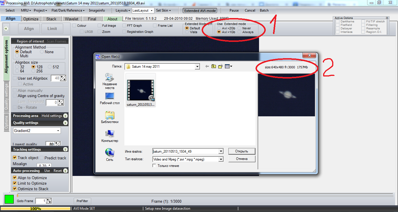 Окей, расскажу некоторые вещи, которые надеюсь помогут вам, если вы планируете или уже занимаетесь астрофото планет. В качестве примера возьмем не Луну, а что то поинтереснее, ну или просто другое. Так же это будет не серия кадров, а снятое мной несжатое потоковое видео. Как вы догадаетесь по фото, в качестве примера взят ролик из архивов и именно планета. Процесс открытия файла аналогичен открытию фото. При этом возможно выпадение диалогового окна, которое задаст вопрос хотите ли вы обрабатывать ролик цветным (если снято в цвете) либо предпочтете оттенки серого. Выбор будет за вами!