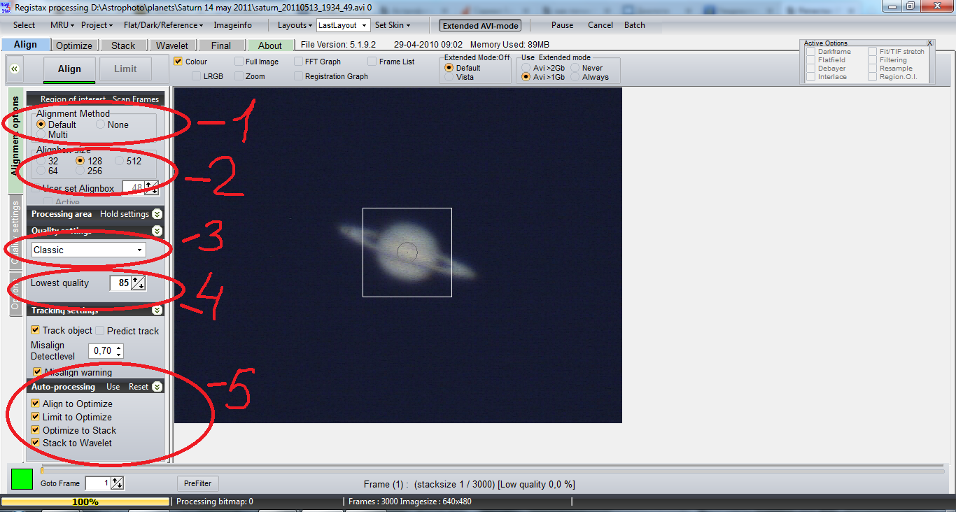 Итак пойдем дальше. Прежде чем преступить к отбору и сортировке кадров, остановимся на первой вкладке, которая таит в себе много немаловажного. Ключевые моменты я выделил цифрами от 1 и до 5. Остальное пока рекомендую не трогать, чтобы не запутаться. Отбор кадров производится по выбранному региону интереса (ROI). При этом регионов интереса может быть несколько, с условно задаваемым размером, но не более разрешения единичного фрейма. За эти вещи отвечают зоны, выделенные цифрами 1 и 2. Зона, выделенная цифрой 3, отвечает за тип математического фильтра по которому производится отбор. Я бы рекомендовал фильтры в первую очередь Classic либо Gradient2. При отборе кадров также нужно установить порог минимально приемлемого качества в процентах. За это отвечает зона, выделенная цифрой 4. В своей практике стараюсь как можно реже применять какие-либо настройки в автоматическом режиме. Поэтому, в поле выделенном цифрой 5 снимаю все галочки, исключая тем самым автоматические решения при отборе. В принципе после этого всего уже можно смело жать кнопку Align