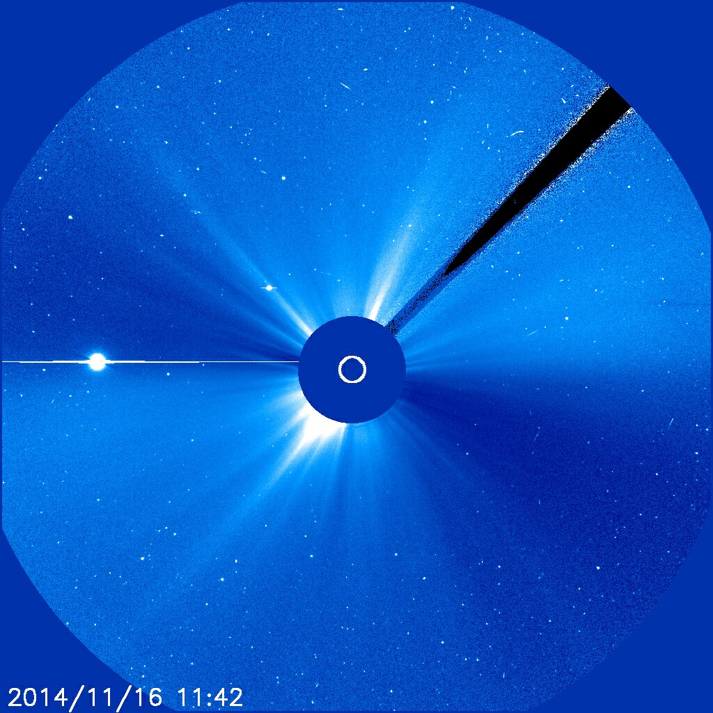 жду появления Венеры. Появиться в конце ноября. Может быть уж и не такой интересный обьект...но мне нравится. Нравится за то,что это очень яркий обьект,видно фазы и за то что можно наблюдать днём. А пока жду... она прячеться возле Солнца. Я так понял со снимка коронографа в кадр попал и Сатурн.
