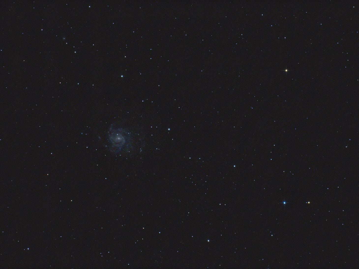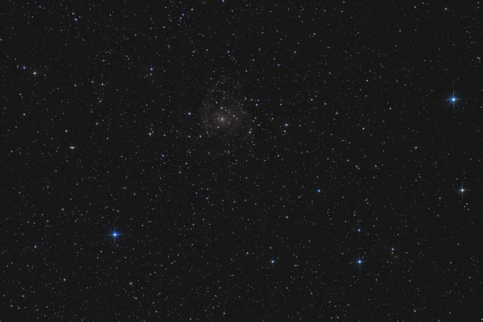 Довольно крупная, но тусклая спиральная галактика из каталога IC под номером 342. Расположена в околополярном созвездии Жирафа и наблюдается через темный пылевой рукав Млечного пути. Труба телескопа SW130/650DS с кома-корректором SW, монтировка от МИЦАРА (ТАЛ-1) с приводом по одной оси, фотоаппарат Canon EOS 550D, балкон, красная зона засветки. Съемки в течении четырех ночей, суммарная выдержка 4 часа, ИСО 6400, обработка ДипСкайСтекер, ФитСтекер, ФШ. Кадр охватывает поле примерно 2 на 1,25 градуса, север слева, 35%.
