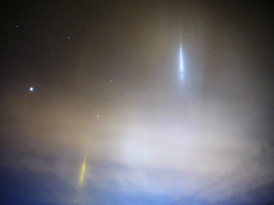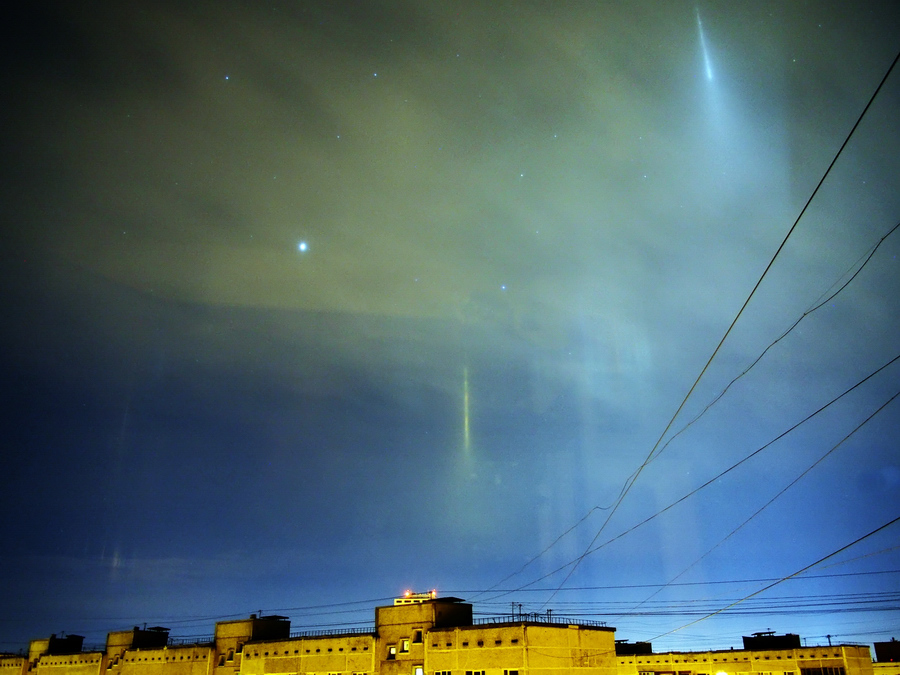 Добрый день ! Сегодня ночью собирался посмотреть на Юпитер и началось полярное сияние Сияния я видел и раньше но таких явлений, как в этот раз не замечал. В небе прямо над городом появились яркие столбики и в течение 15min стояли на месте, затем плавно начали изчезать. Снимоки низкого качества (спешил) извеняюсь.