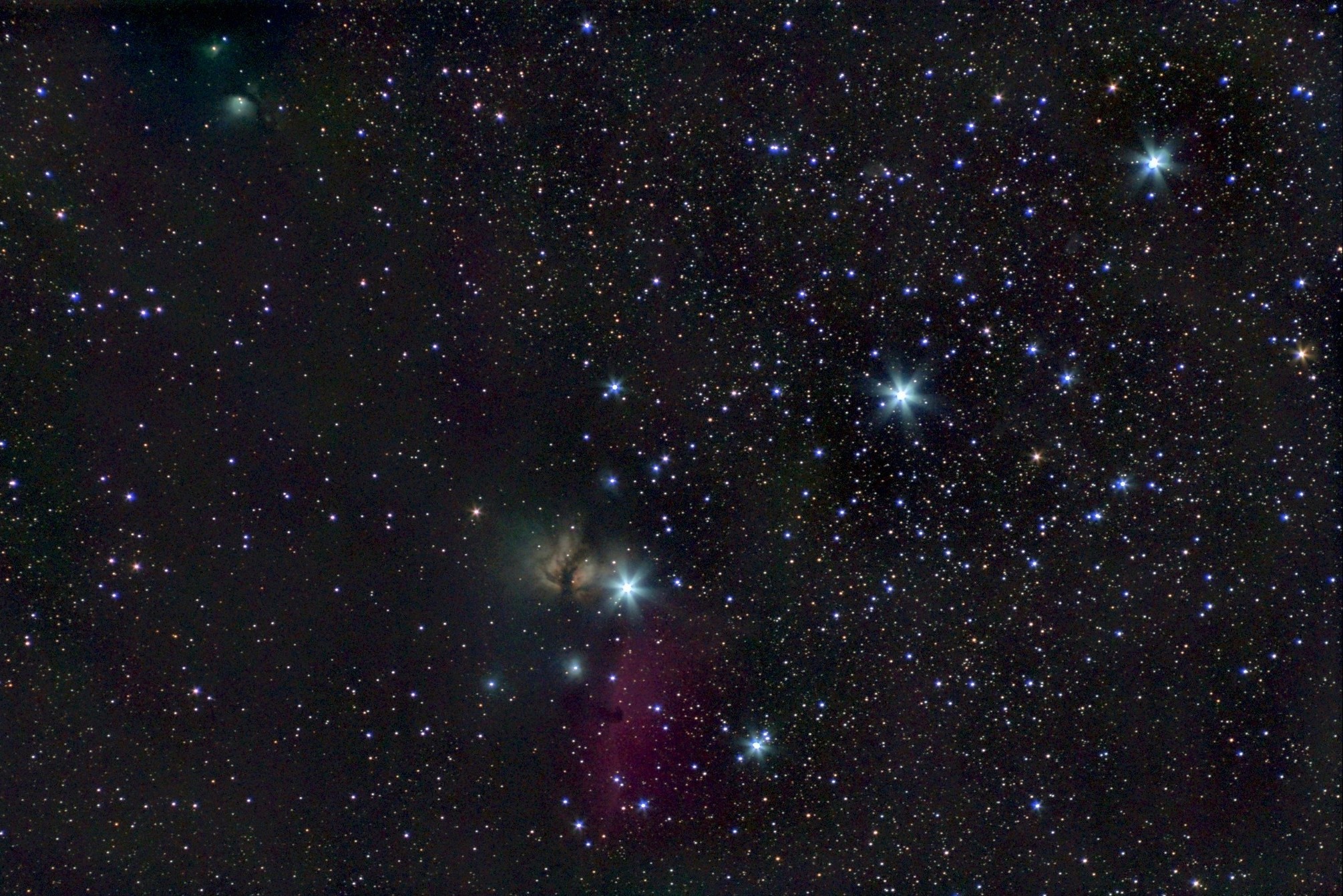Большинству знакомый астеризм " пояс Ориона". Состоит из трех бело-голубых звезд (голубых сверхгигантов): Альнитак (ζ Ориона), Альнилам (ε Ориона), Минтака (δ Ориона) . В кадре можно наблюдать три знаменитые туманности "конская голова (IC 434, Barnard 33)", "пламя (NGC 2024)" и "M 78 (NGC 2068)"