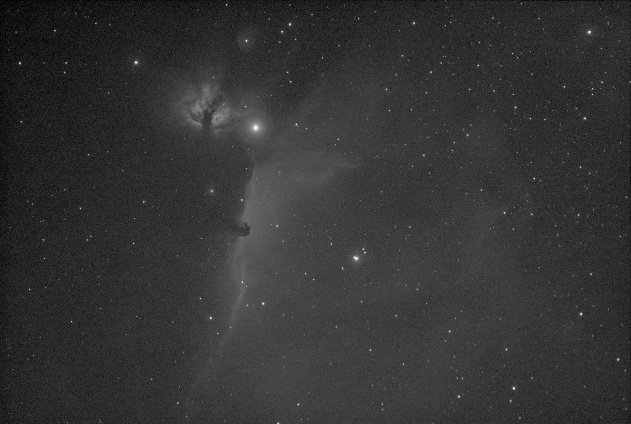 Чуть ниже пояса Ориона. Туманности "Конская голова" (B33+IC434) и "Пламя" (NGC2024). Одиночный кадр с экспозицией 600 сек. Исходник получен в 2013 году на удаленной обсерватории в Австралии.  Просмотров: 1062