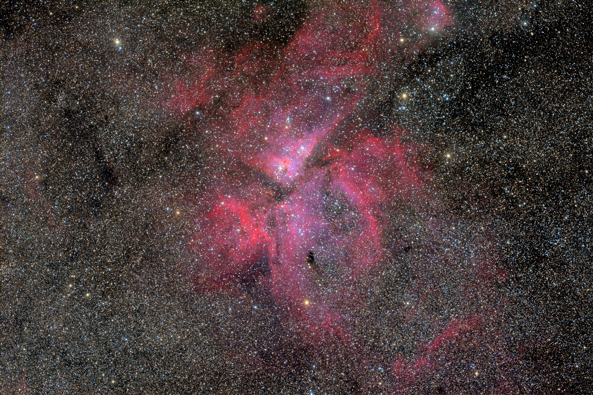 Carina Nebula или Туманность Киля (NGC3372) - крупная эмиссионная туманность в южном созвездии Киль. Кроме газа и пыли, содержит в себе несколько звездных скоплений и ассоциаций. Объект недоступен для наблюдений в средних широтах северного полушария. Сумма девяти кадров по 180 сек. Исходники получены в 2013 году на удаленной обсерватории в Австралии.  Просмотров: 1418